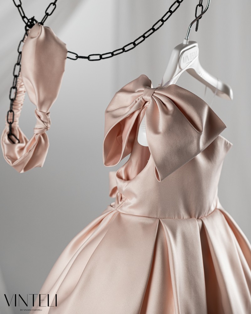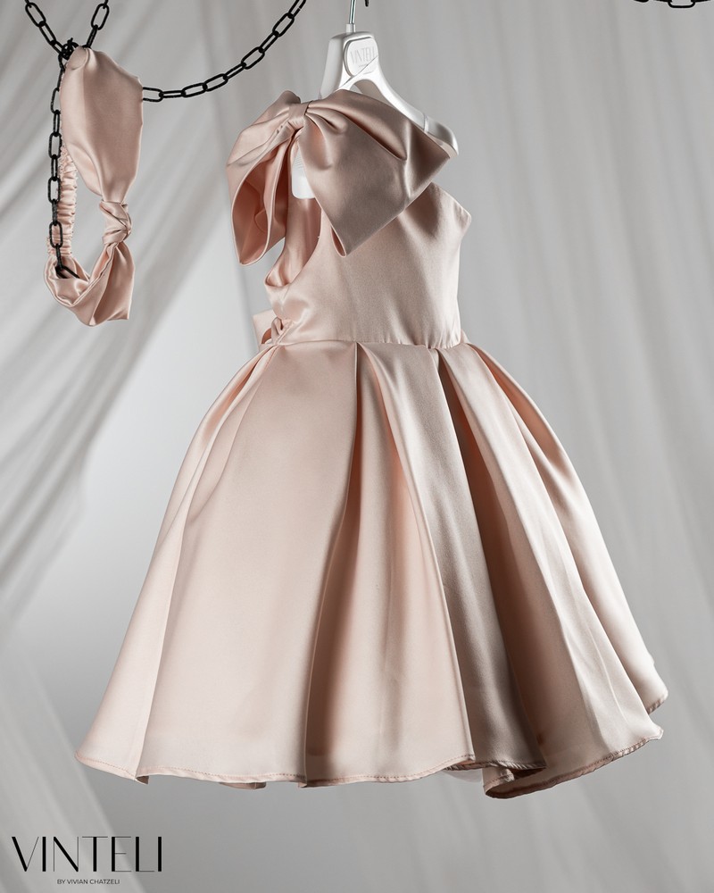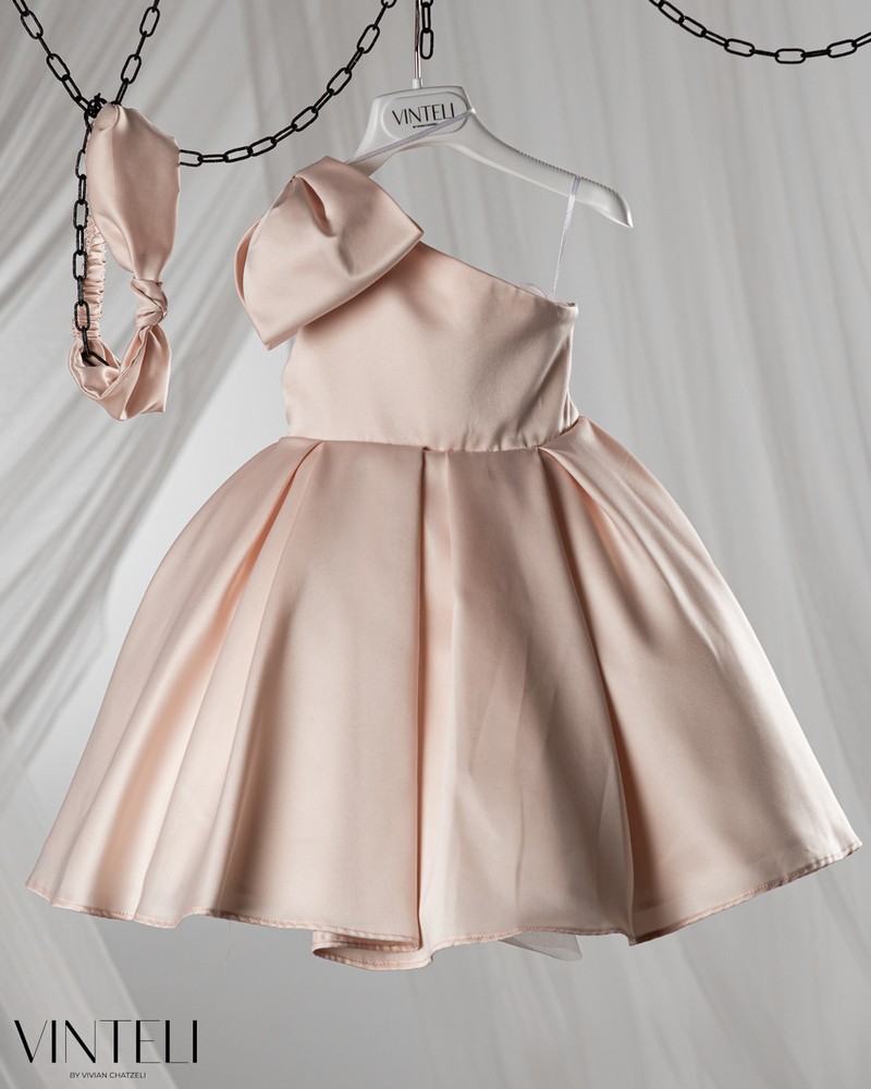 Βαπτιστικό φόρεμα σε σωμών απόχρωση που αποπνέει κομψότητα και διακριτική πολυτέλεια. Το μπούστο είναι λιτό με ασύμμετρο κόψιμο στον έναν ώμο που χαρίζει μια μοντέρνα και ιδιαίτερη αισθητική, ενώ ο σατέν εντυπωσιακός φιόγκος δίνει χαρακτήρα και ξεχωρίζει διακριτικά. Η φούστα ανοίγει σε πλούσια γραμμή, δημιουργώντας όμορφη κίνηση και όγκο. Συνοδεύεται από ασορτί κορδέλα μαλλιών, ολοκληρώνοντας αρμονικά την εμφάνιση. Μια κομψή και ξεχωριστή επιλογή για βάπτιση, ιδανική για ιδιαίτερες και αξέχαστες στιγμές.