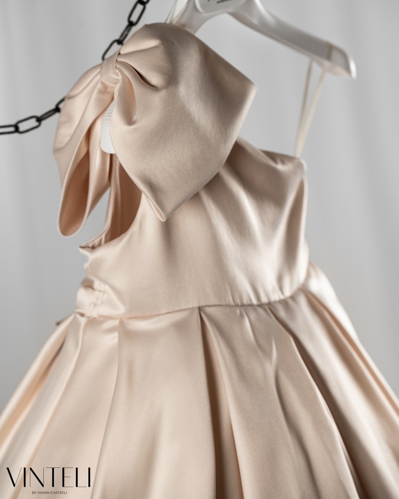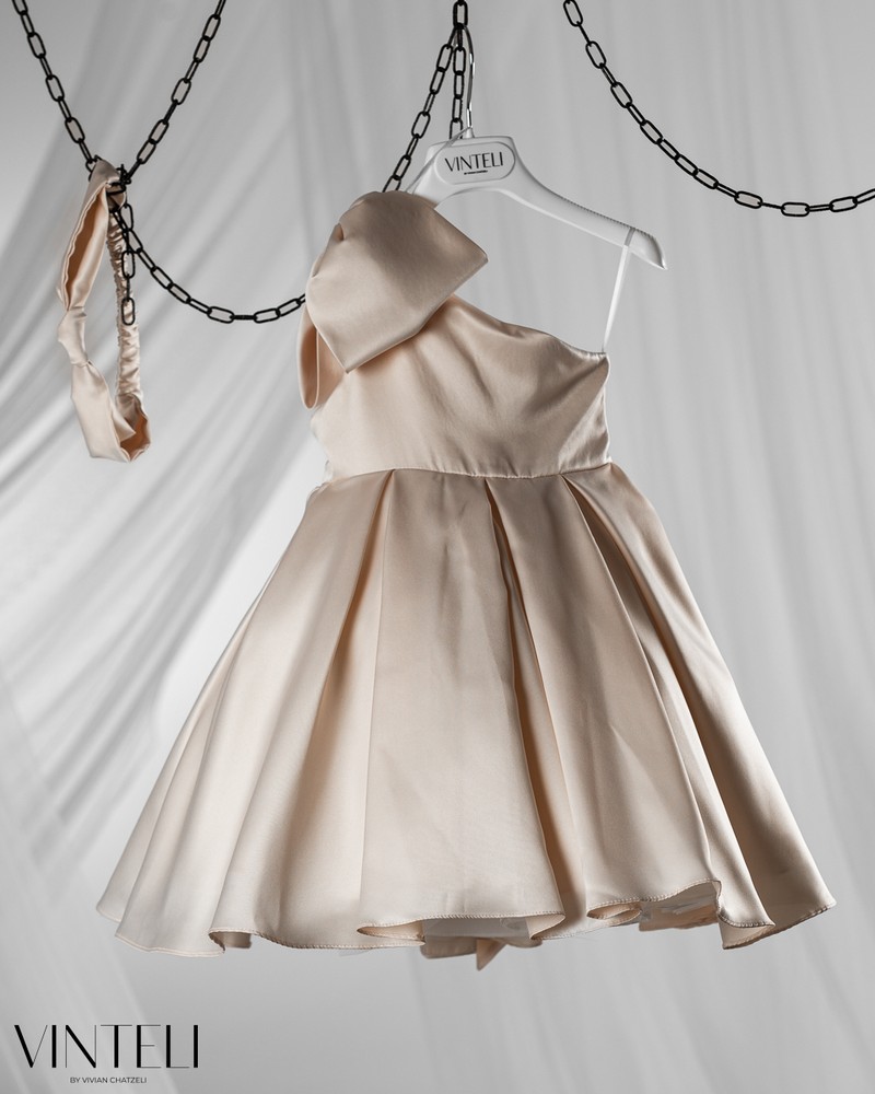 Βαπτιστικό φόρεμα σε μπεζ απόχρωση που αποπνέει κομψότητα και διακριτική πολυτέλεια. Το μπούστο είναι λιτό με ασύμμετρο κόψιμο στον έναν ώμο που χαρίζει μια μοντέρνα και ιδιαίτερη αισθητική, ενώ ο σατέν εντυπωσιακός φιόγκος σδίνει χαρακτήρα και ξεχωρίζει διακριτικά. Η φούστα ανοίγει σε πλούσια γραμμή, δημιουργώντας όμορφη κίνηση και όγκο. Συνοδεύεται από ασορτί κορδέλα μαλλιών, ολοκληρώνοντας αρμονικά την εμφάνιση. Μια κομψή και ξεχωριστή επιλογή για βάπτιση, ιδανική για ιδιαίτερες και αξέχαστες στιγμές.