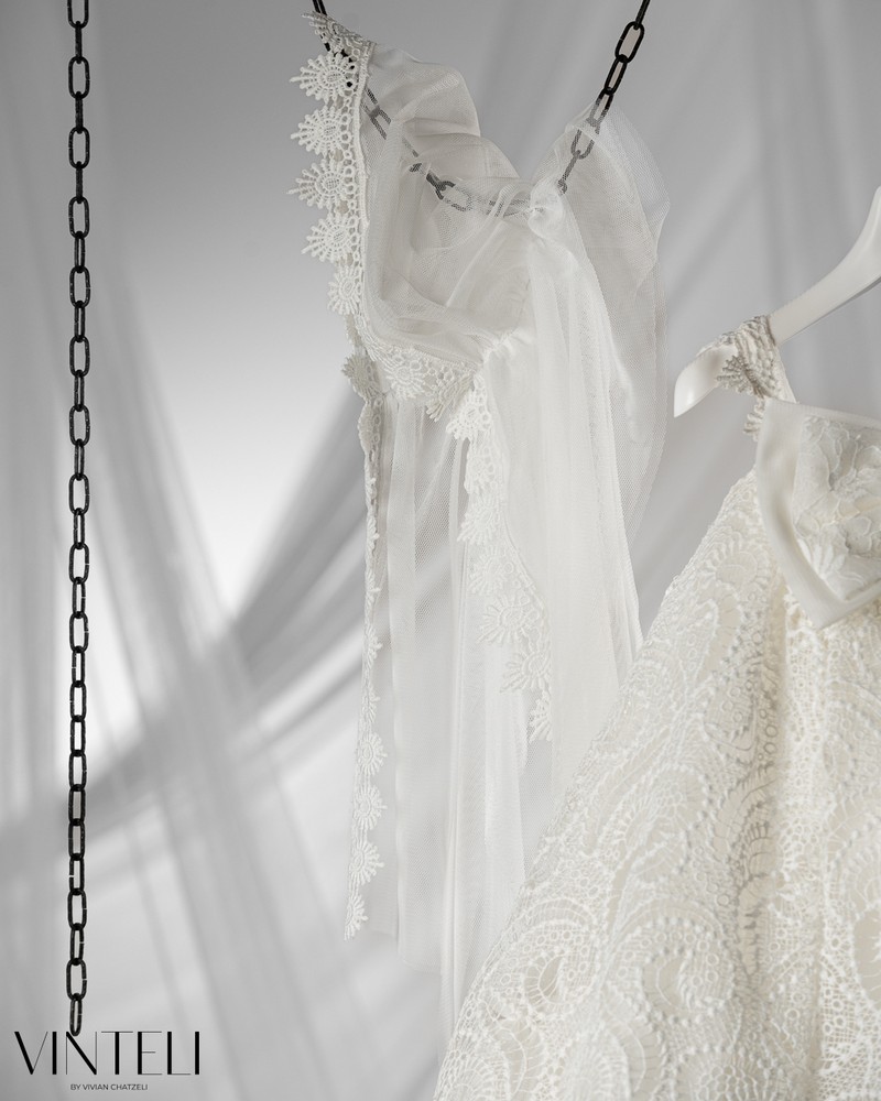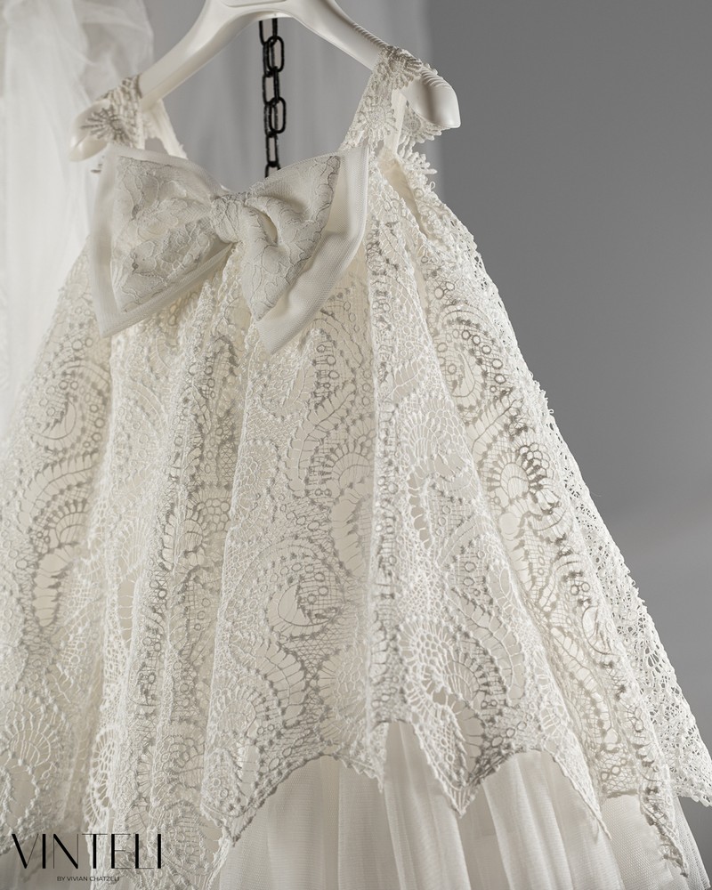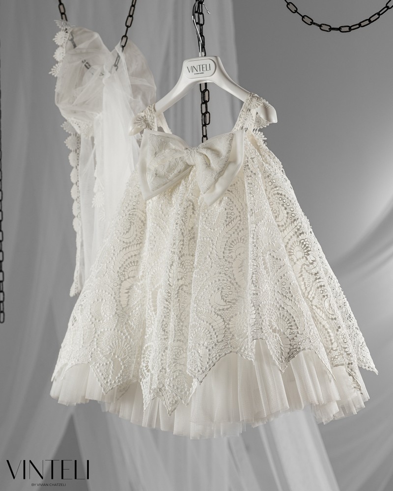 Βαπτιστικό φόρεμα που αποπνέει κομψότητα και ιδιαίτερο χαρακτήρα. Το σχέδιο ξεχωρίζει με την πλούσια δαντέλα που καλύπτει όλο το φόρεμα, δημιουργώντας ένα εντυπωσιακό αποτέλεσμα. Το μπούστο αγκαλιάζει απαλά το σώμα, ενώ στο επάνω μέρος διακοσμείται με έναν κομψό φιόγκο που δίνει μια διακριτική αλλά ξεχωριστή πινελιά. Η φούστα ανοίγει σε ανάλαφρη γραμμή, ενώ το ασύμμετρο τελείωμα της δαντέλας χαρίζει μοναδικότητα στο σύνολο. Συνοδεύεται από ασορτί πλαϊνή μαντήλα για τα μαλλιά, ολοκληρώνοντας ιδανικά την εμφάνιση. Μια ξεχωριστή και ρομαντική επιλογή για βάπτιση.