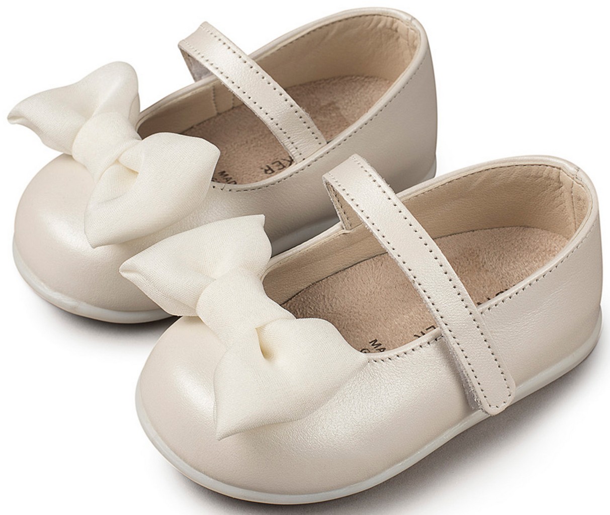 Δερμάτινο Γοβάκι Μονή Μπαρέτα με Φιόγκο Οργάντζα από Δέρμα Πέρλα σε Εκρού Χρώμα
