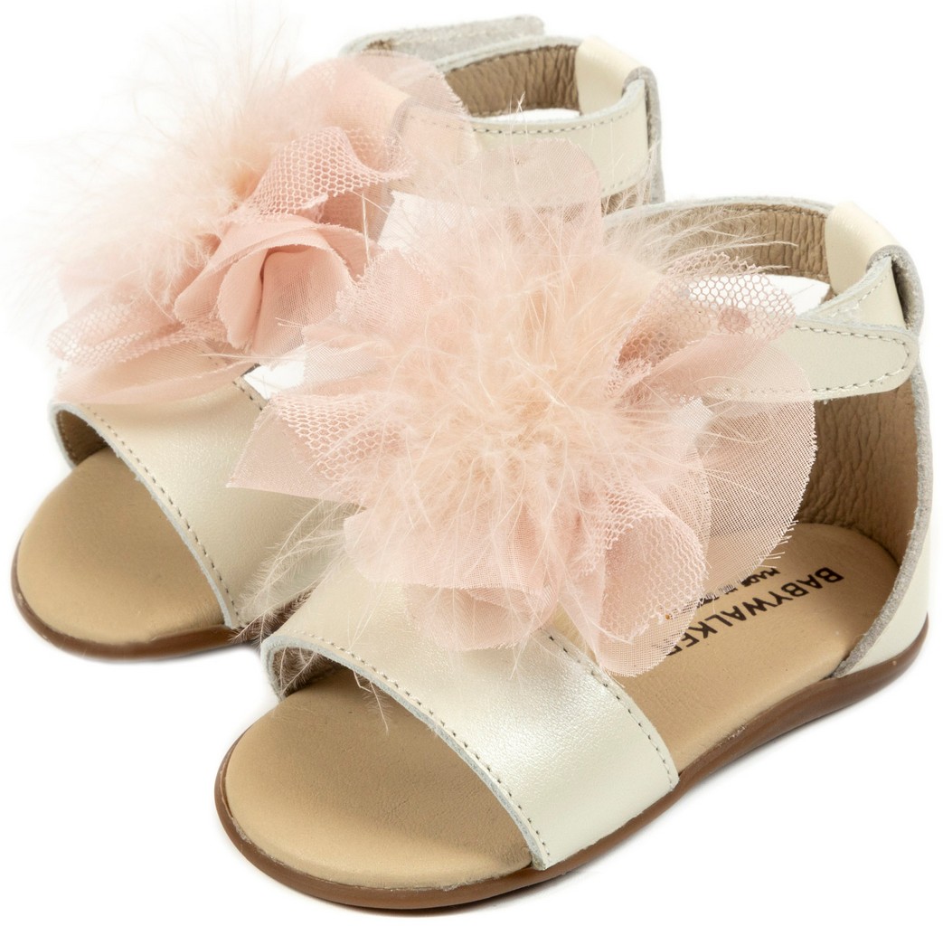 Δερμάτινο Πέδιλο Διακοσμημένο με Chiffon Πον Πον από Δέρμα Πέρλα σε Εκρού Ροζ Χρώμα