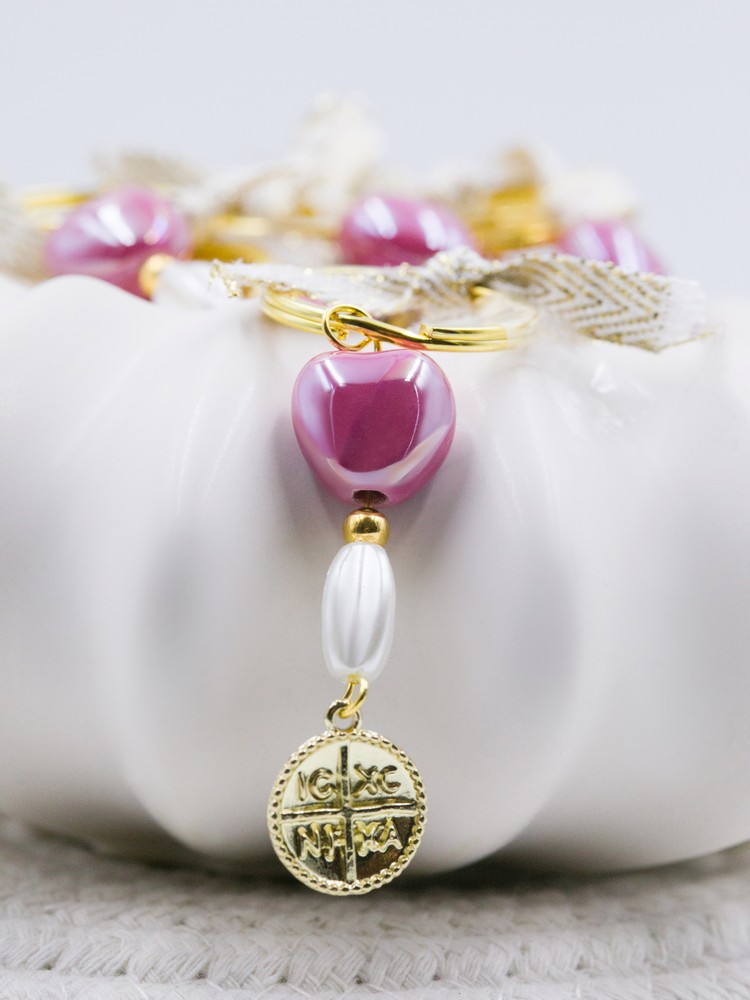 Μαρτυρικό μπρελόκ με πέρλα, κεραμική καρδιά φούξια, κωνσταντινάτο και φιόγκο από χρυσή κορδέλα. Οι φωτογραφίες έχουν υποστεί επεξεργασία και τα χρώματα ίσως να διαφέρουν λίγο στην πραγματικότητα. Η τιμή αφορά συσκευασία 50 τεμαχίων.