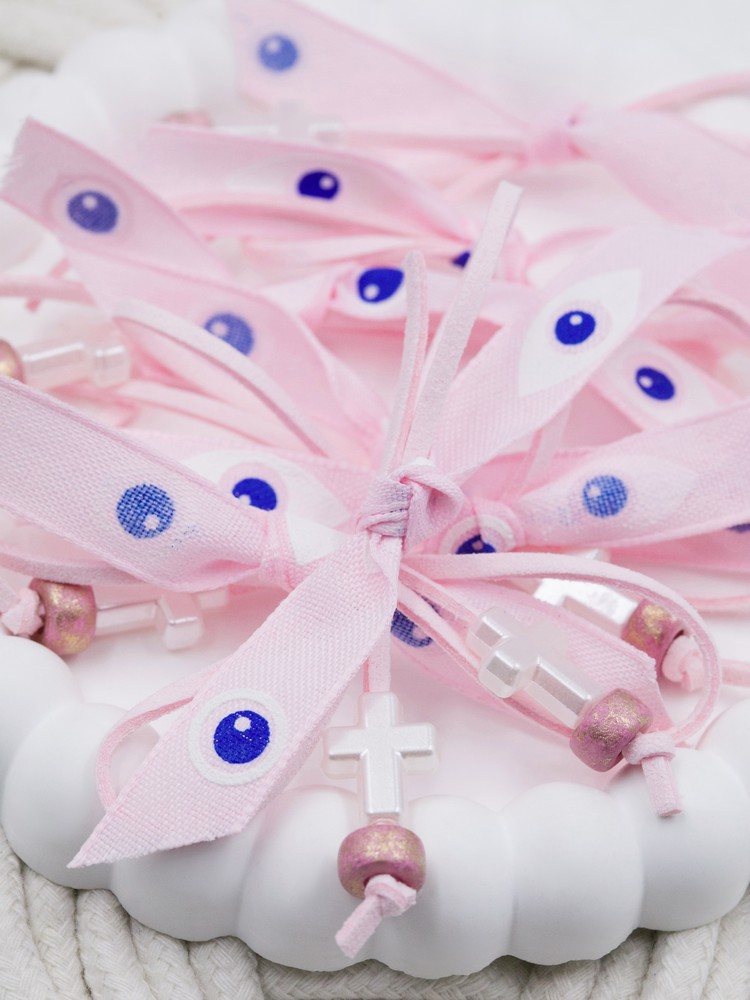 Μαρτυρικό πέτου, ροζ σουέτ κορδόνι, ακρυλικός περλέ σταυρός κεραμική χάντρα και κορδέλα με σχήμα μάτι. Οι φωτογραφίες έχουν υποστεί επεξεργασία και τα χρώματα ίσως να διαφέρουν λίγο στην πραγματικότητα. Η τιμή αφορά συσκευασία 50 τεμαχίων.