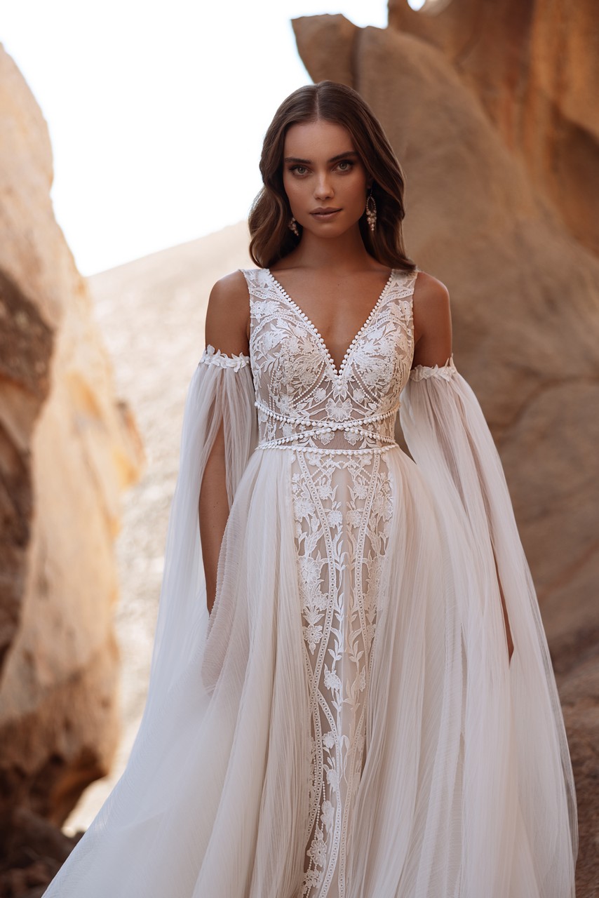 Το Salome είναι ένα νυφικό σχεδιασμένο για τη νύφη που θέλει να αισθάνεται ταυτόχρονα θηλυκή και δυναμική. Το εφαρμοστό δαντελένιο μπούστο, διακοσμημένο με περίτεχνα κεντήματα, ρέει άψογα μέσα σε μια ελαφριά φούστα που κινείται με κάθε βήμα. Η βαθιά λαιμόκοψη V προσθέτει αυτοπεποίθηση, ενώ το λεπτό δαντελένιο περίγραμμα πλαισιώνει τη σιλουέτα με ακρίβεια. Αυτό που κάνει τη Salome πραγματικά αξέχαστη είναι τα αποσπώμενα μανίκια από τούλι. Ντερέιντ αβίαστα από τους ώμους, δημιουργούν κίνηση και παρουσία, μεταμορφώνοντας το νυφικό σε κάτι εντυπωσιακό αλλά και αιθέριο. Με ή χωρίς αυτά, η Salome προσφέρει ευελιξία—είτε θέλετε να κάνετε μια τολμηρή είσοδο στην τελετή είτε να χορέψετε ελεύθερα στη δεξίωση.