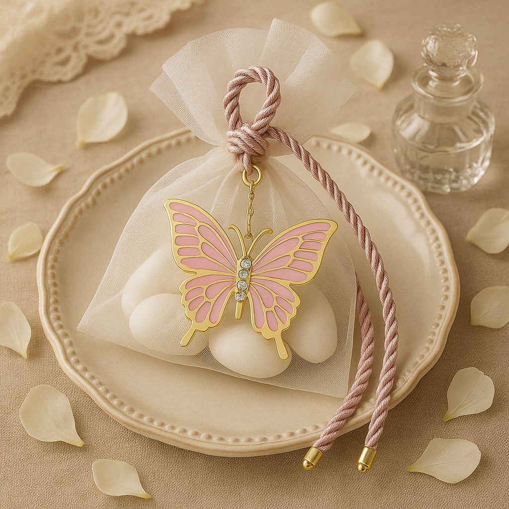 Μπομπονιέρα βάπτισης μεταλλικό κρεμαστό μπρελόκ πεταλούδα που συνδυάζει την τρυφερότητα του ροζ με τη ζεστασιά του χρυσού. Μια δημιουργία με αέρινη αίσθηση που αιχμαλωτίζει το φως και την ομορφιά της στιγμής.