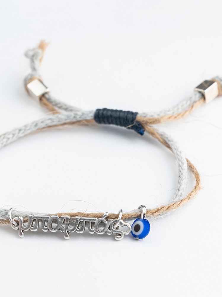 Βραχιόλι με διπλό κορδόνι γκρι και μπεζ και μακραμέ μπλε