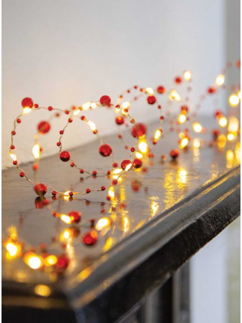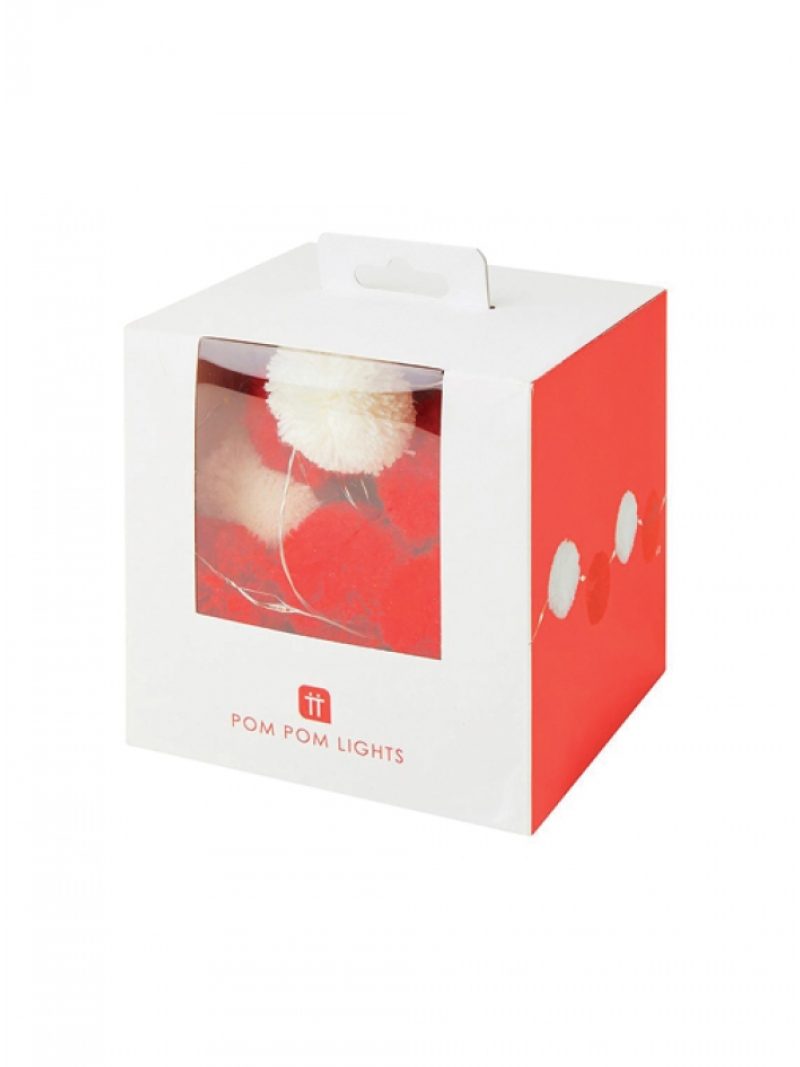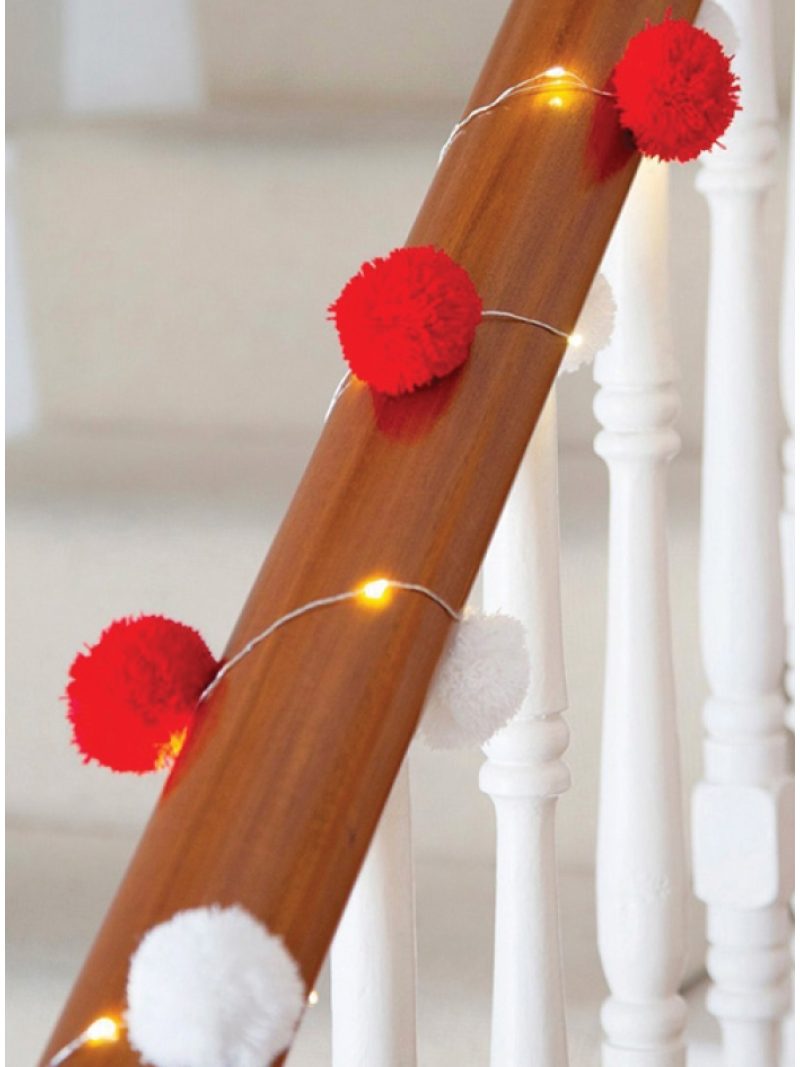 Διακοσμητικά φωτάκια με pom poms σε λευκή και κόκκινη απόχρωση.