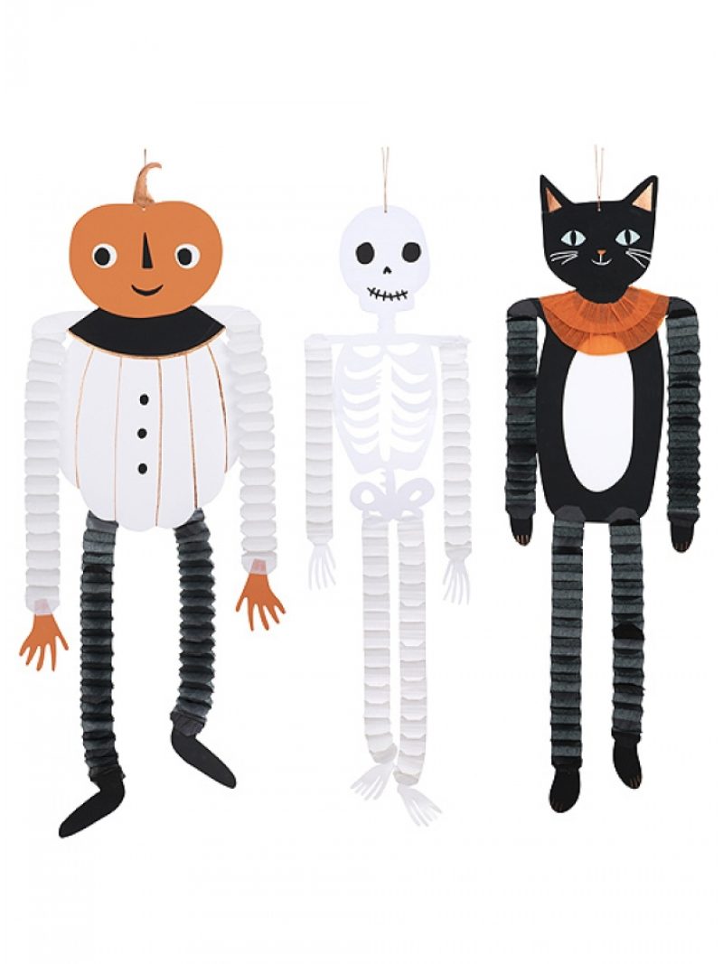 Χάρτινες κρεμαστές διακοσμητικές halloween φιγούρες σε 3 σχέδια, σκελετός, μαύρη γάτα και κολοκύθα.