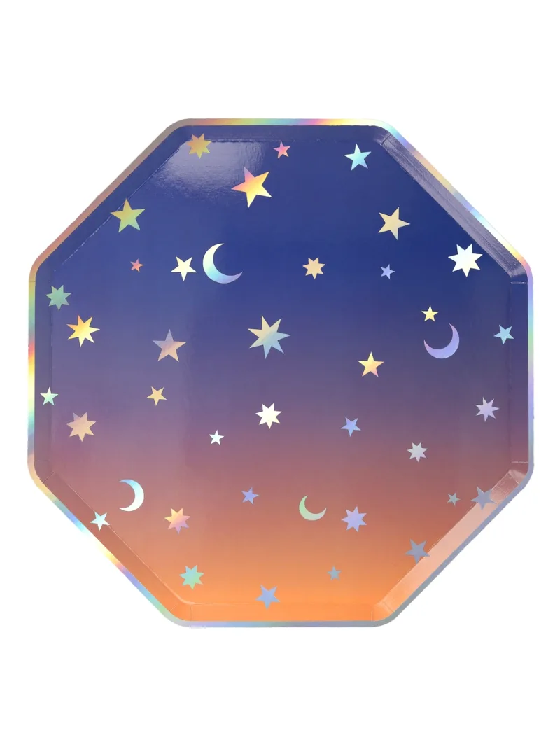 Οι καλεσμένοι του πάρτι σας θα λατρέψουν τις λιχουδιές σας που σερβίρονται σε αυτά τα χαρούμενα ombre πιάτα με μεταλλικές foil αποχρώσεις με αστέρια και φεγγάρια.