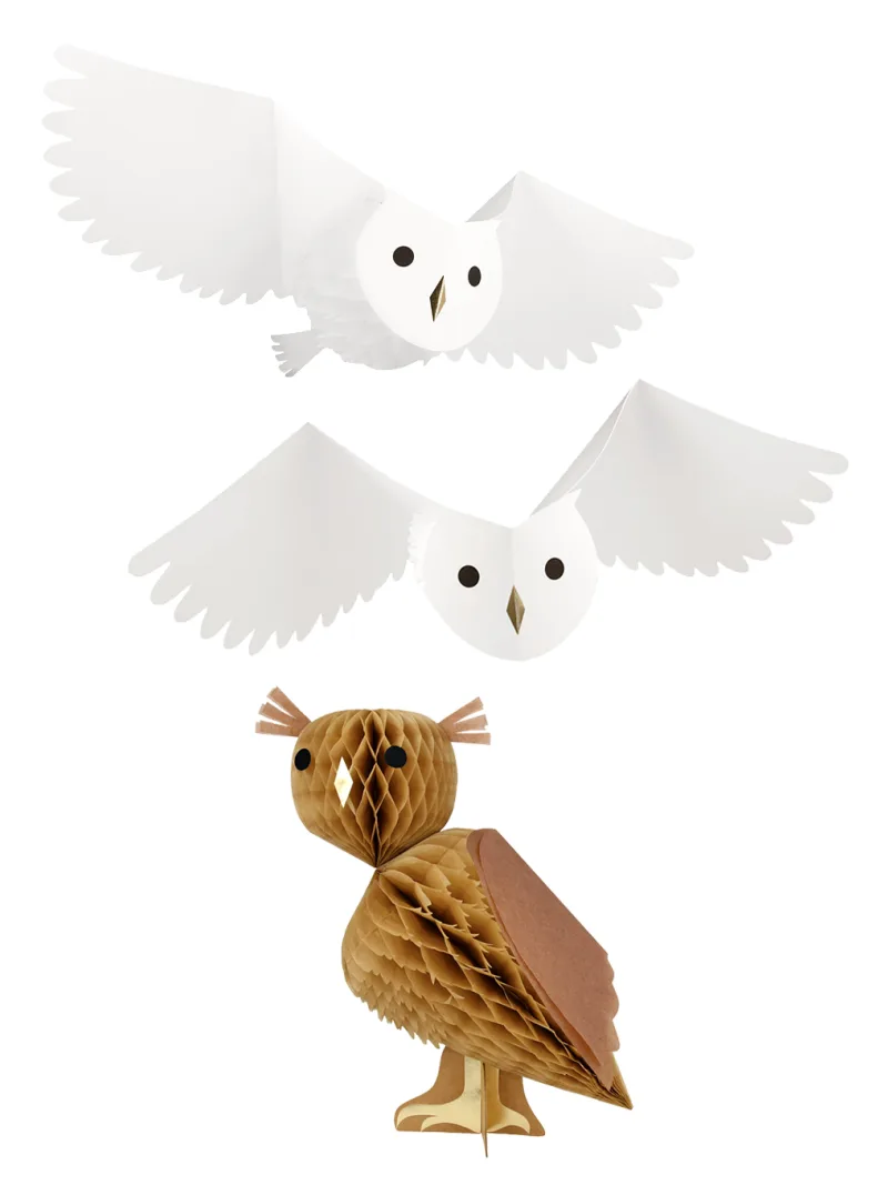 Οι λευκές ιπτάμενες κουκουβάγιες δημιουργούν εκπληκτικά κρεμαστά διακοσμητικά και η ανεξάρτητη καφέ κουκουβάγια θα κουρνιάζει ήσυχα με χαρά στο τραπέζι του πάρτι ή στο τζάμι σας,