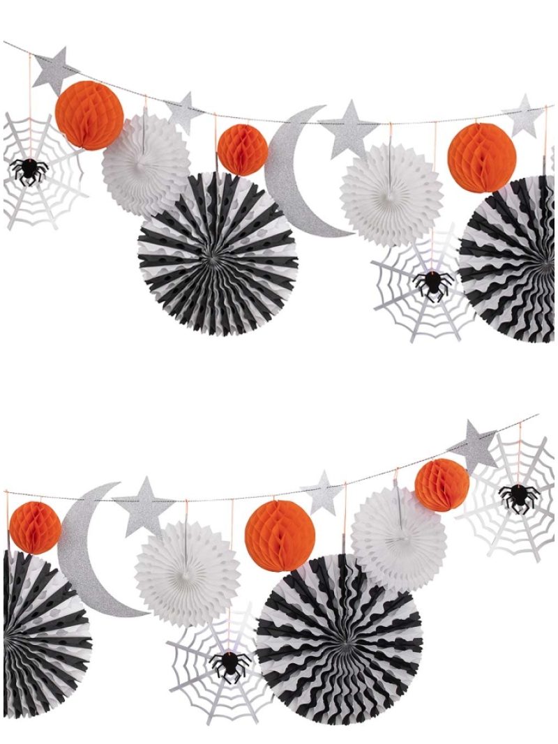 Χάρτινη halloween γιρλάντα με honeycomb στοιχεία, βεντάλιες, ιστούς αράχνης και αστέρια, περασμένα σε ασορτί κορδόνι.