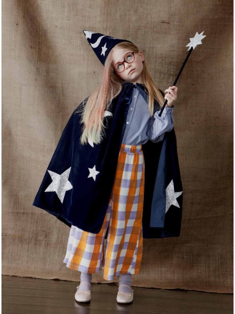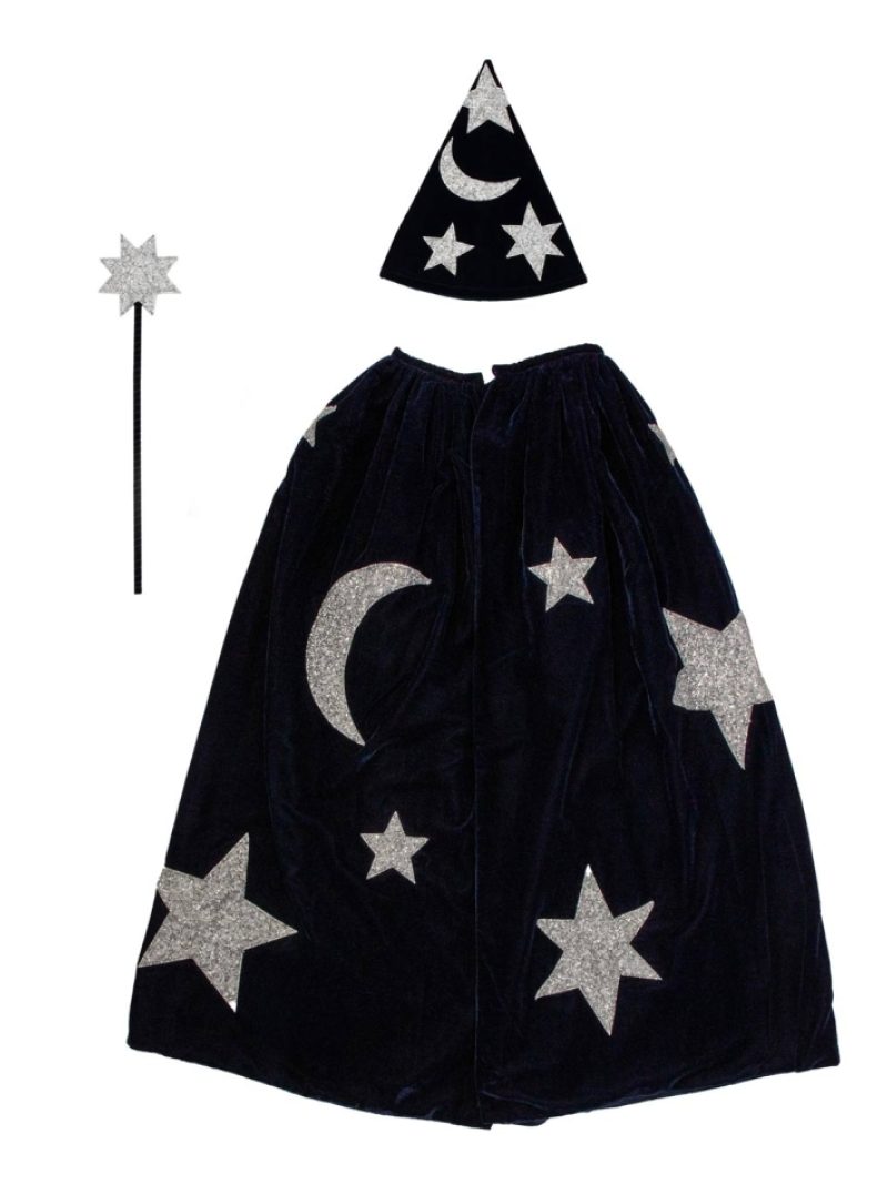Η κάπα είναι βελούδινη σκούρου μπλε χρώματος με ασημί αστέρια και φεγγαράκια και συνοδεύεται από αντίστοιχο καπέλο και ραβδί.
