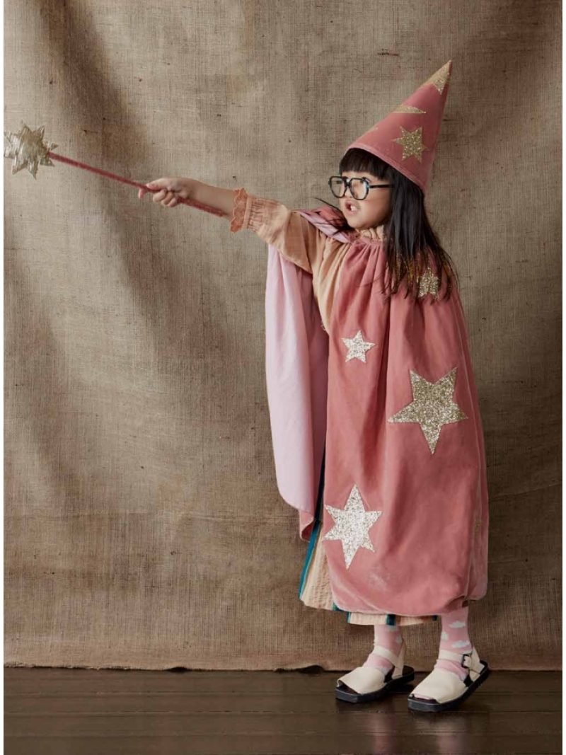 Η κάπα είναι βελούδινη ροζ χρώματος με χρυσά αστέρια και φεγγαράκια και συνοδεύεται από αντίστοιχο καπέλο και ραβδί.