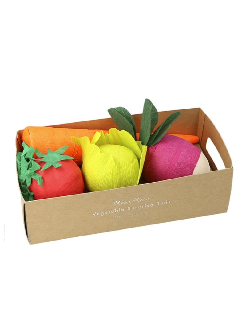 Κάθε λαχανικό περιλαμβάνει 1 γόμα, 2 αυτοκόλλητα, 1 χάρτινο καπελάκι, 1 βραχιολάκι και 1 αστείο.