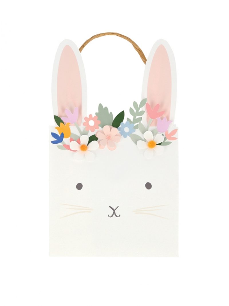 Χάρτινες τσάντες δώρου με πασχαλινό θέμα και σχέδιο λαγουδάκι στολισμένο με λουλουδάκια.
