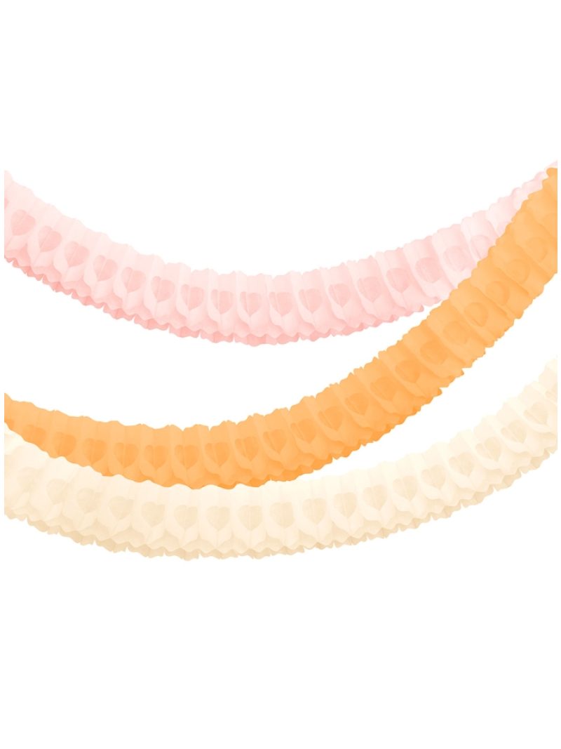 Σετ που περιλαμβάνει χάρτινες honeycomb γιρλάντες σε 3 χρώματα, ροζ, πορτοκαλί και μπεζ.