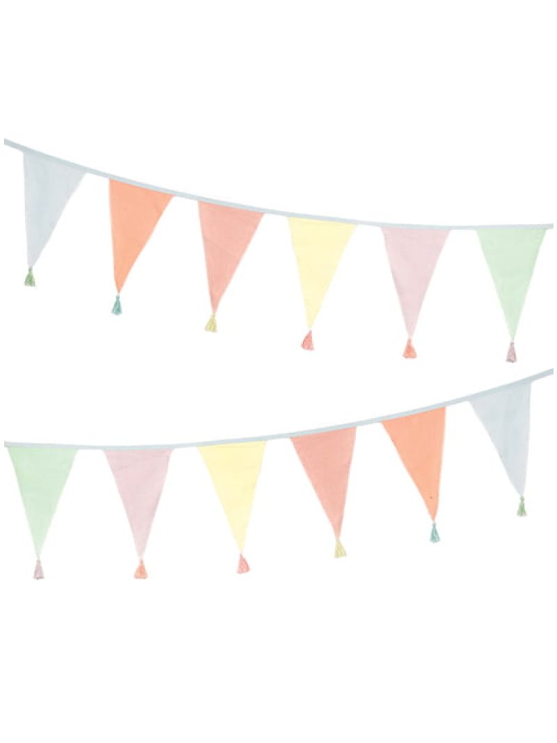Υφασμάτινη γιρλάντα με 12 σημαιάκια και tassels σε pastel χρώματα, περασμένα σε ασορτί κορδονάκι.