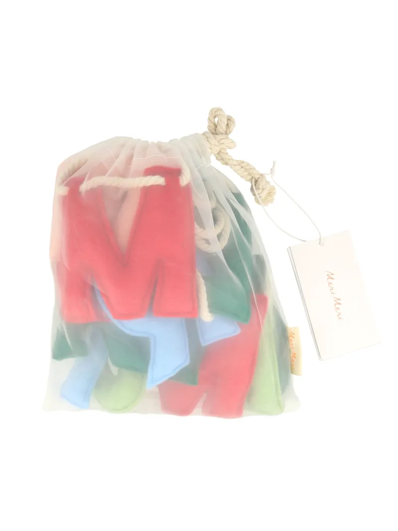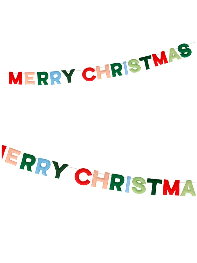 Υφασμάτινη χριστουγεννιάτικη γιρλάντα με πολύχρωμα γράμματα Merry Christmas, όλα περασμένα σε ασορτί κορδόνι.