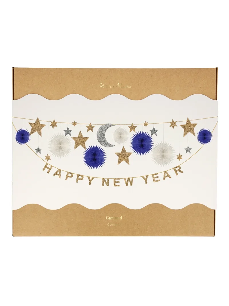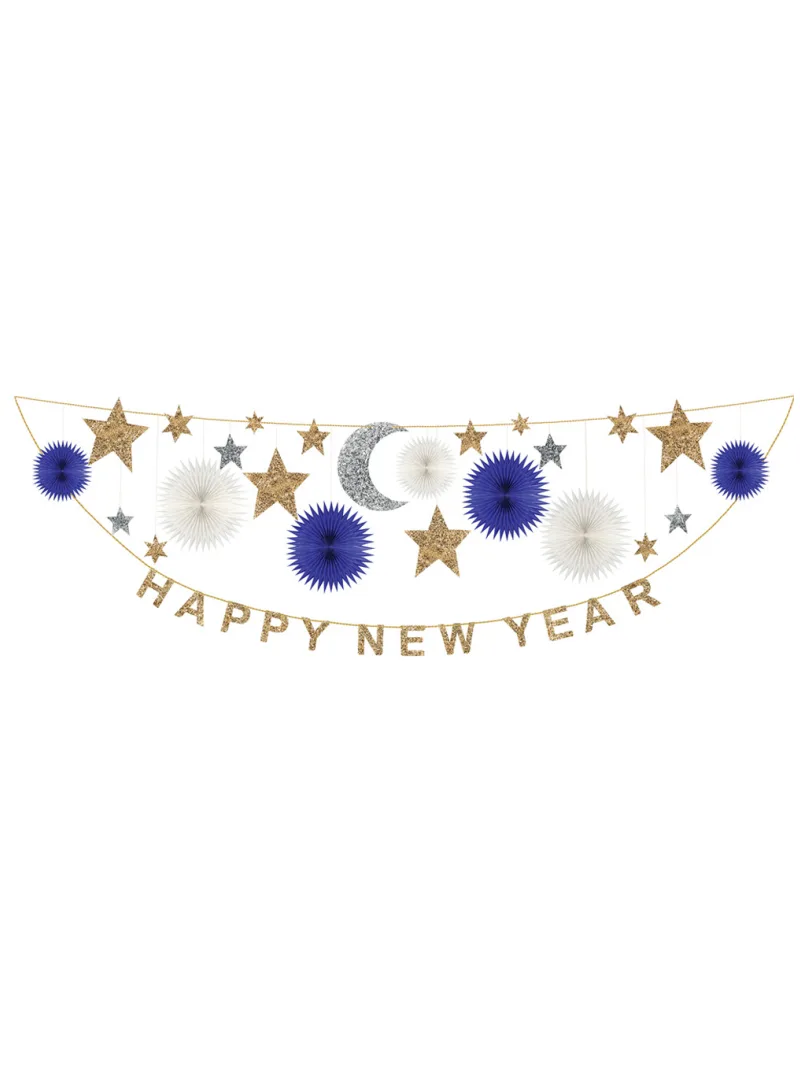 Χριστουγεννιάτικη γιρλάντα με λευκές και μπλε βεντάλιες, χρυσά και ασημένια αστέρια, ασημένιο φεγγάρι και χρυσά γράμματα Happy New Year, όλα περασμένα σε ασορτί κορδόνι.