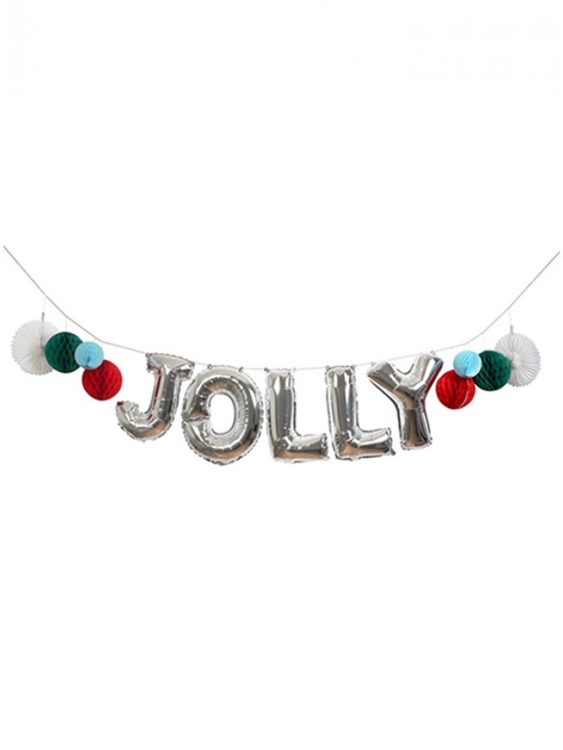 Ασημένια γιρλάντα μπαλόνι με το μήνυμα ‘’Jolly’’ με τελείωμα από λεπτό φύλλο μετάλλου (foil).