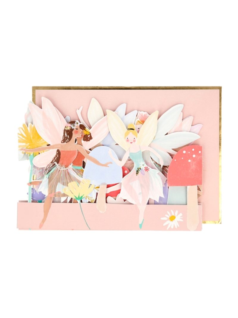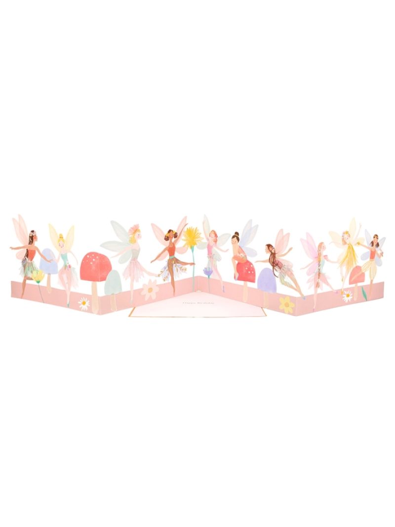 Χάρτινη ευχετήρια κάρτα με νεράιδες και το μήνυμα “Happy Birthday”.