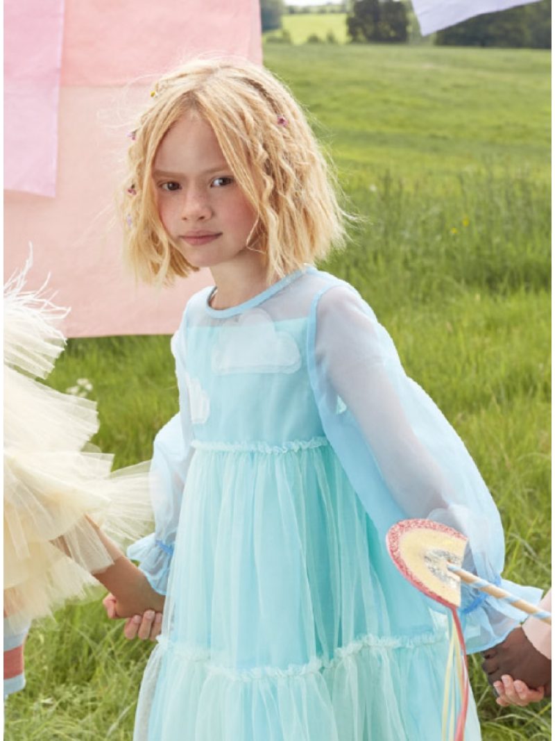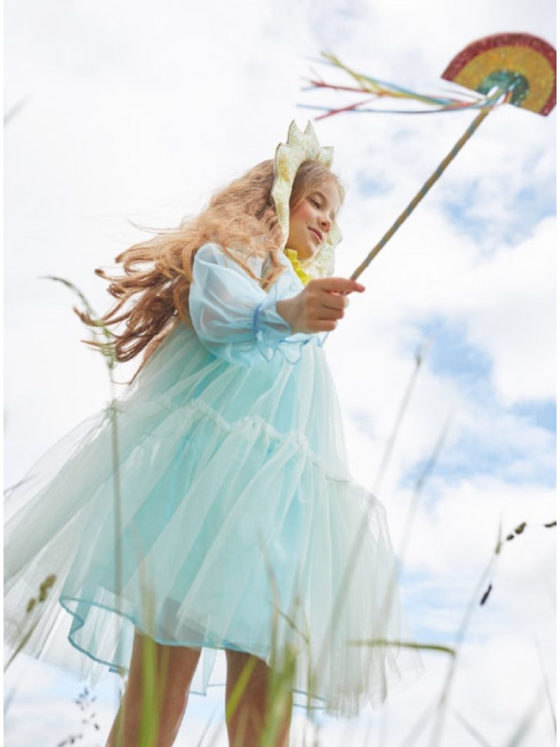 Σετ μεταμφίεσης συννεφάκι που αποτελείται από φόρεμα και ραβδάκι. Το φόρεμα στο πάνω μέρος είναι κατασκευασμένο από μπλε οργάντζα και στο κάτω μέρος από τούλι πράσινης απόχρωσης. Διακοσμείται από συννεφάκια και συνοδεύεται από ραβδάκι που στην κορυφή στολίζεται με υφασμάτινο ουράνιο τόξο με glitter. Μέγεθος: 5-6 ετών Μήκος φορέματος: 83,8 εκ.