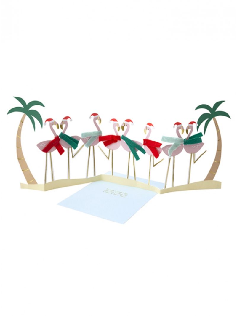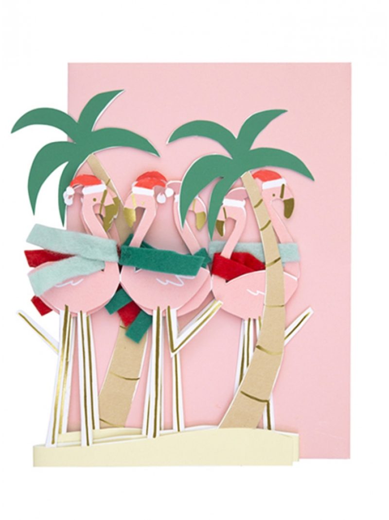 Ευχετήρια αναδιπλούμενη κάρτα με flamingo για τις γιορτινές ευχές των Χριστουγέννων.