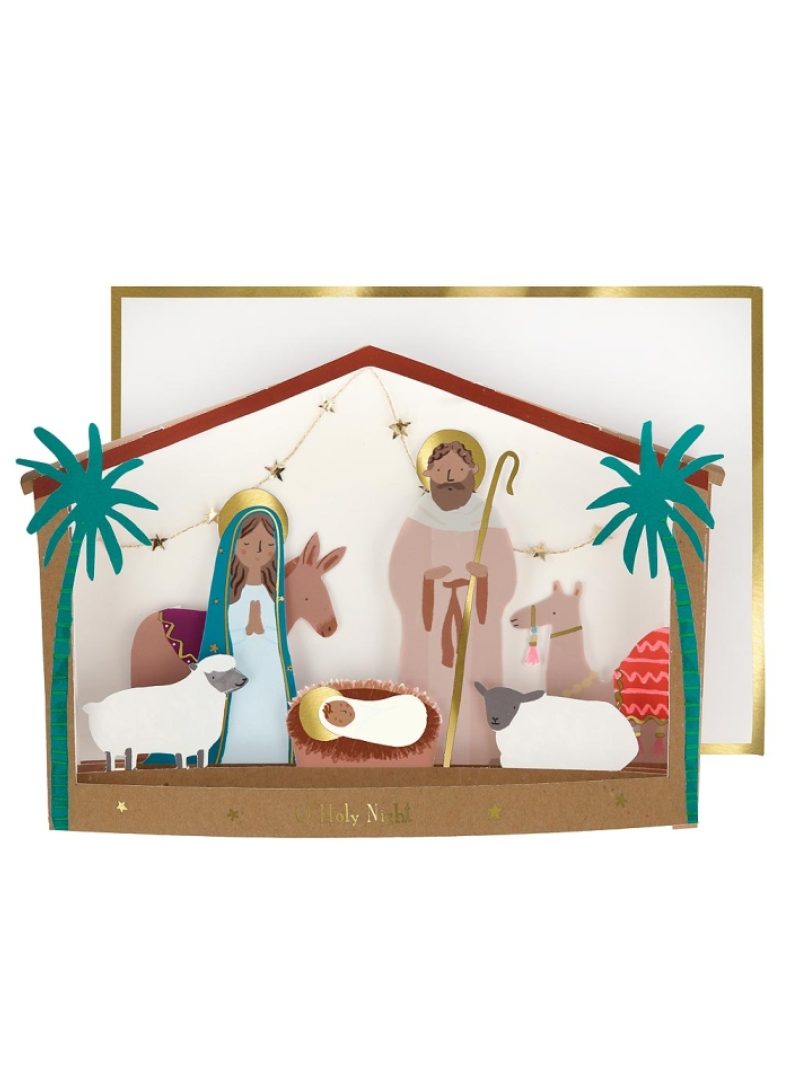 Χάρτινη χριστουγεννιάτικη ευχετήρια κάρτα με τη σκηνή της γέννησης του Χριστού.