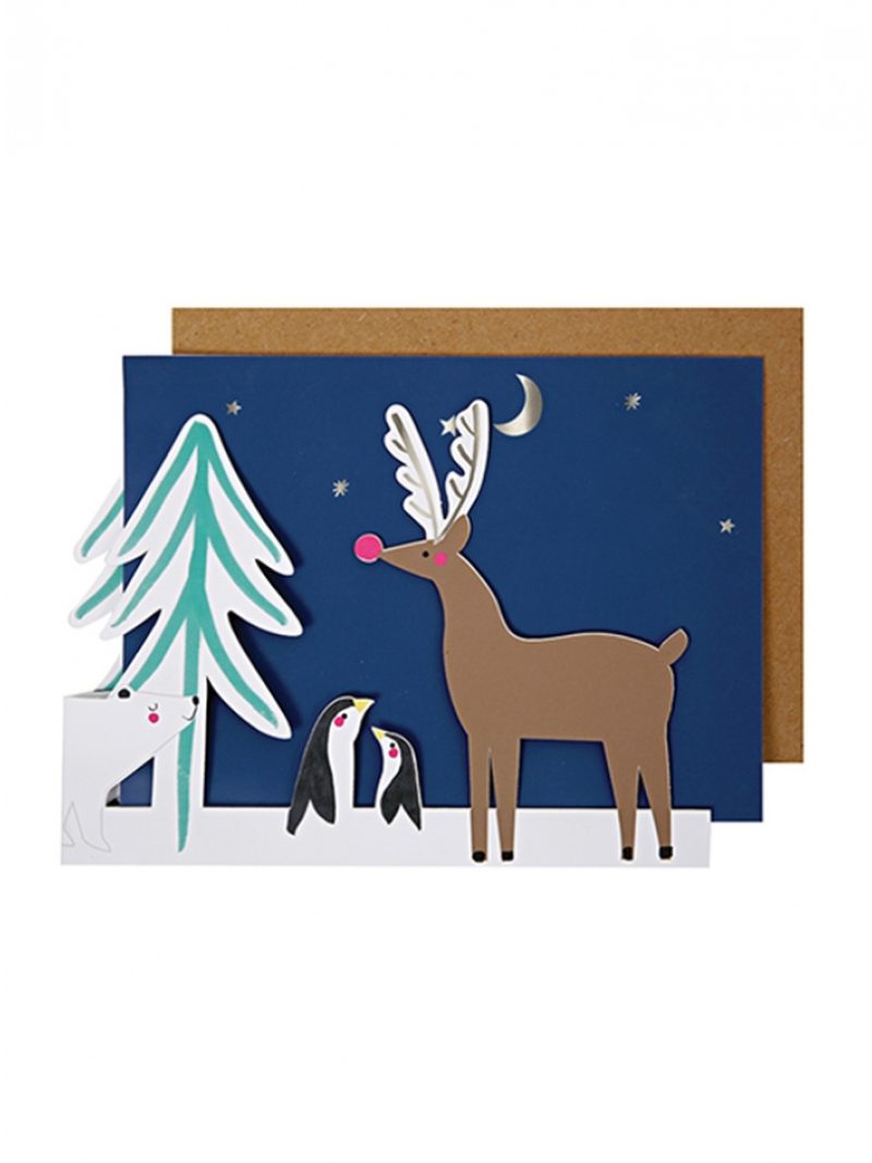 Η πτυσσόμενη κάρτα διακοσμείται με την πολική αρκούδα, τους πιγκουίνους και τον τάρανδο του Άι Βασίλη . Συνοδεύεται από καφέ φάκελο.