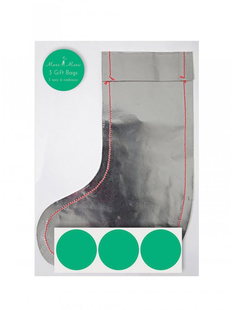 Τσάντα δώρου σε σχήμα μικρής ασημί κάλτσας με πορτοκαλί ραφές.