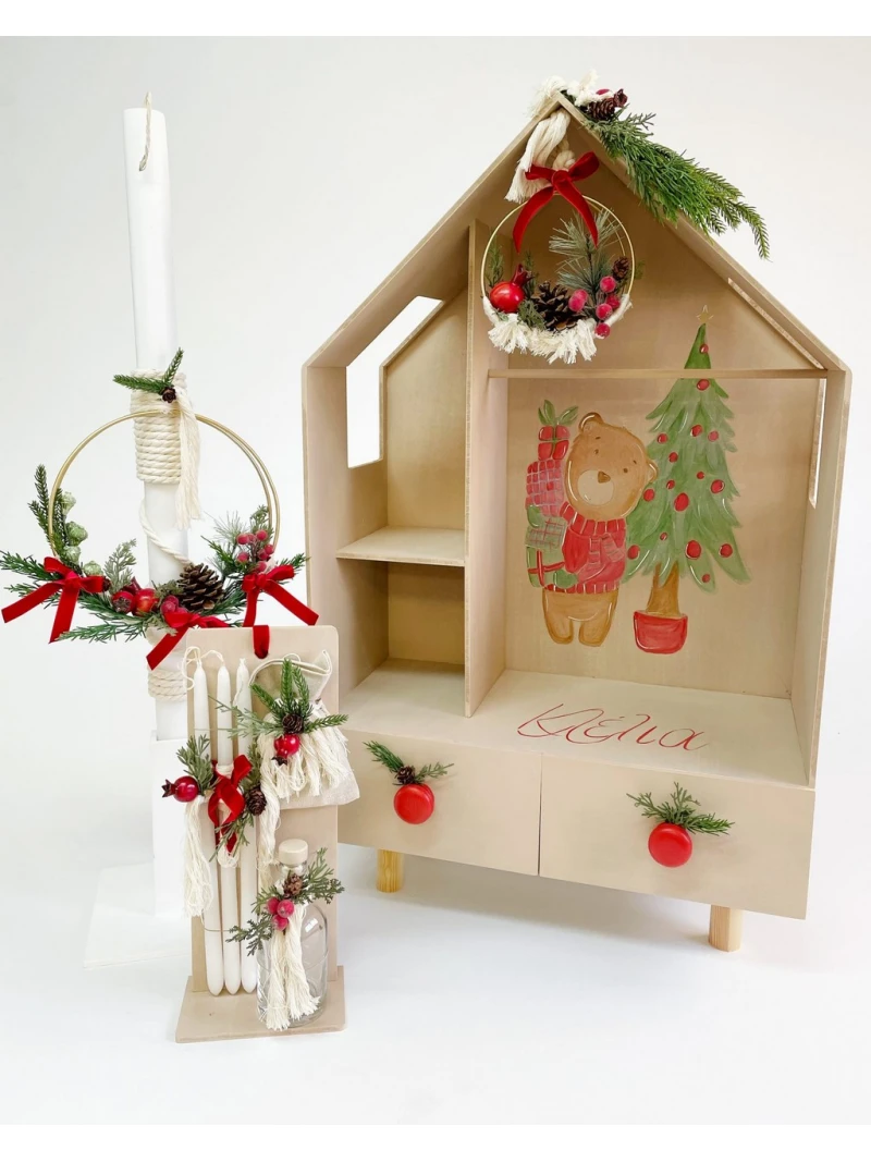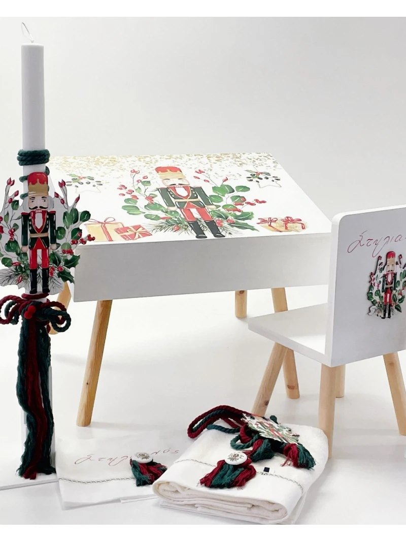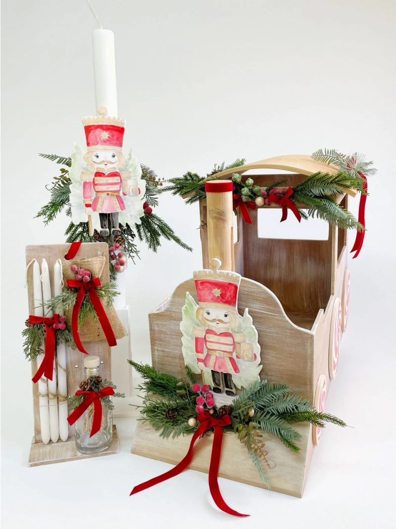 Ολοκληρωμένο βαπτιστικό σετ με θέμα ρομαντικά λουλούδια και όνομα, διακοσμημένο με χειροποίητη ζωγραφική και χρυσές λεπτομέρειες. Ένα κομψό και διαχρονικό σετ, ιδανικό για μια παραμυθένια βάπτιση.