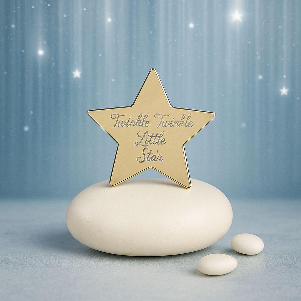 Μια ξεχωριστή μπομπονιέρα διακοσμημένη με ένα χρυσό αστέρι, μεταφέρει μια ιδιαίτερη ευχή γεμίζοντας τον χώρο με λάμψη και αισιοδοξία.