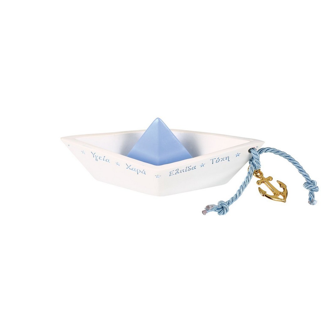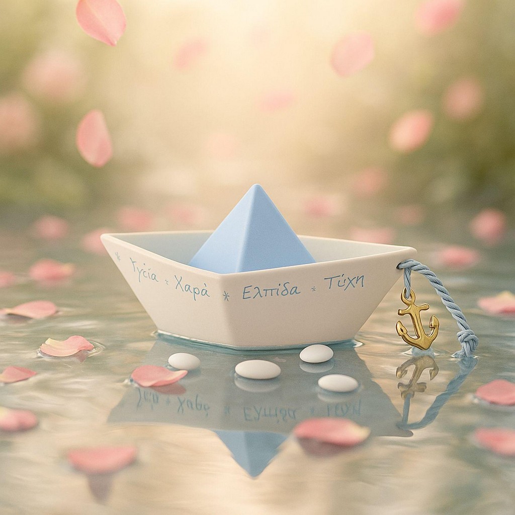 Μπομπονιέρα γάμου – βάπτισης διακοσμητική βαρκούλα που συνδυάζει τη μαγεία της θάλασσας με προσωπικές ευχές.