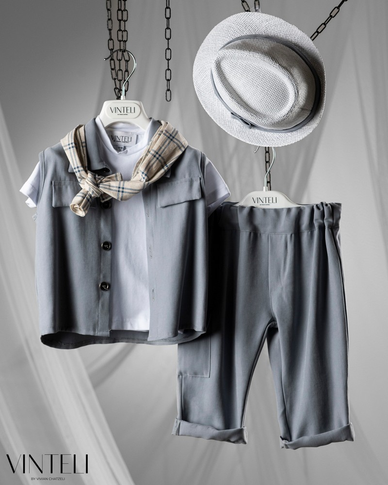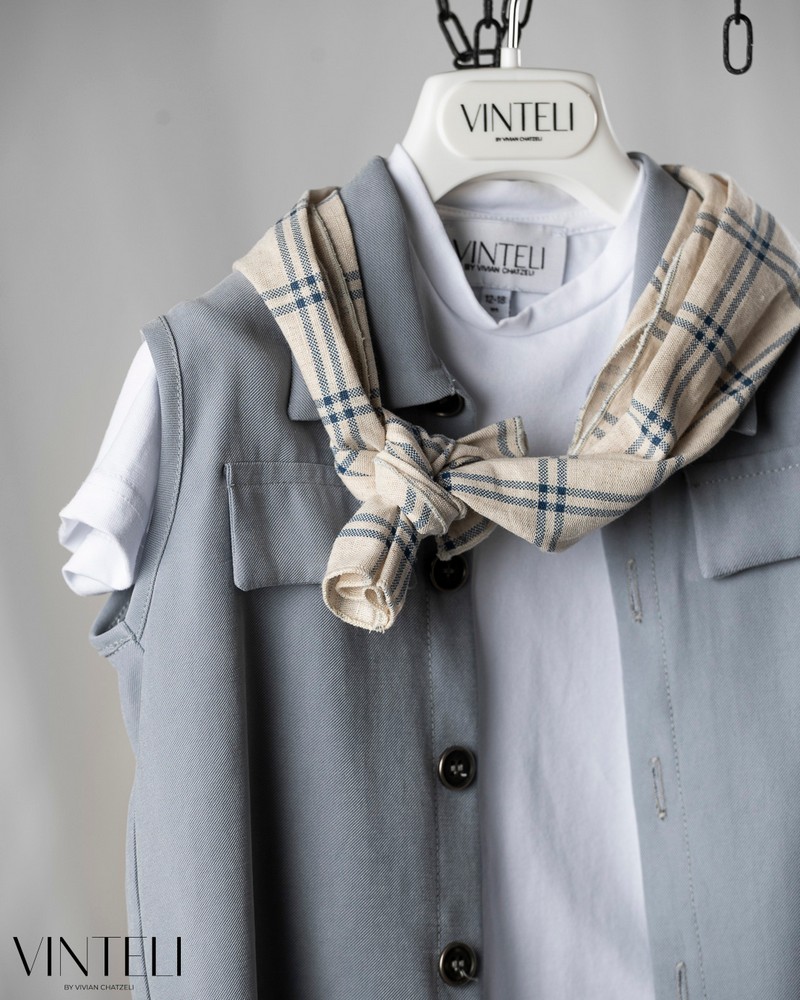 Ένα κομψό βαπτιστικό σύνολο με ισορροπημένη αισθητική. Το λευκό t-shirt συνδυάζεται με γιλέκο και παντελόνι στην ίδια απαλή απόχρωση, δημιουργώντας ένα αρμονικό και διακριτικό αποτέλεσμα. Το καρό φουλάρι προσθέτει μια ήπια πινελιά, ενώ το καπέλο ολοκληρώνει το σύνολο με κομψότητα.