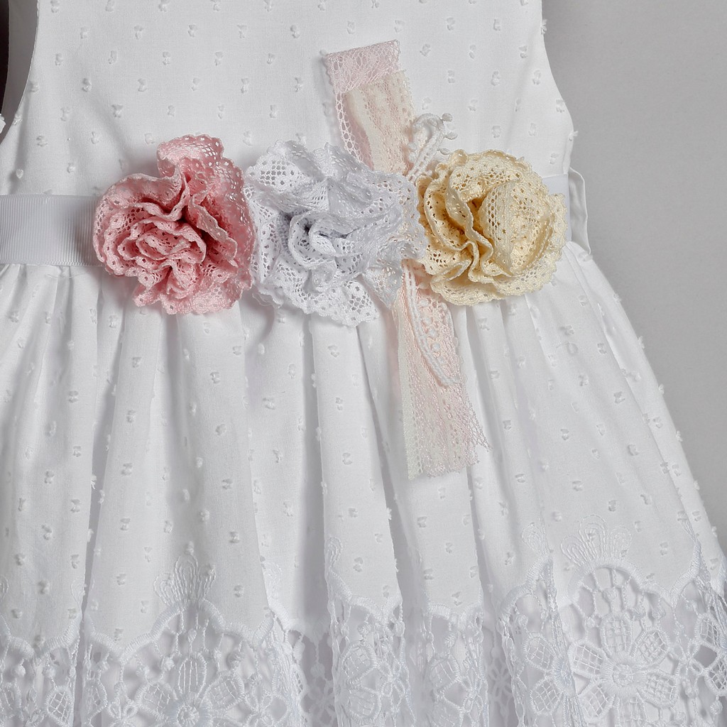 Φόρεμα από άσπρο μπροντερί στολισμένο με γκρο ζώνη και πλεκτά λουλούδια.