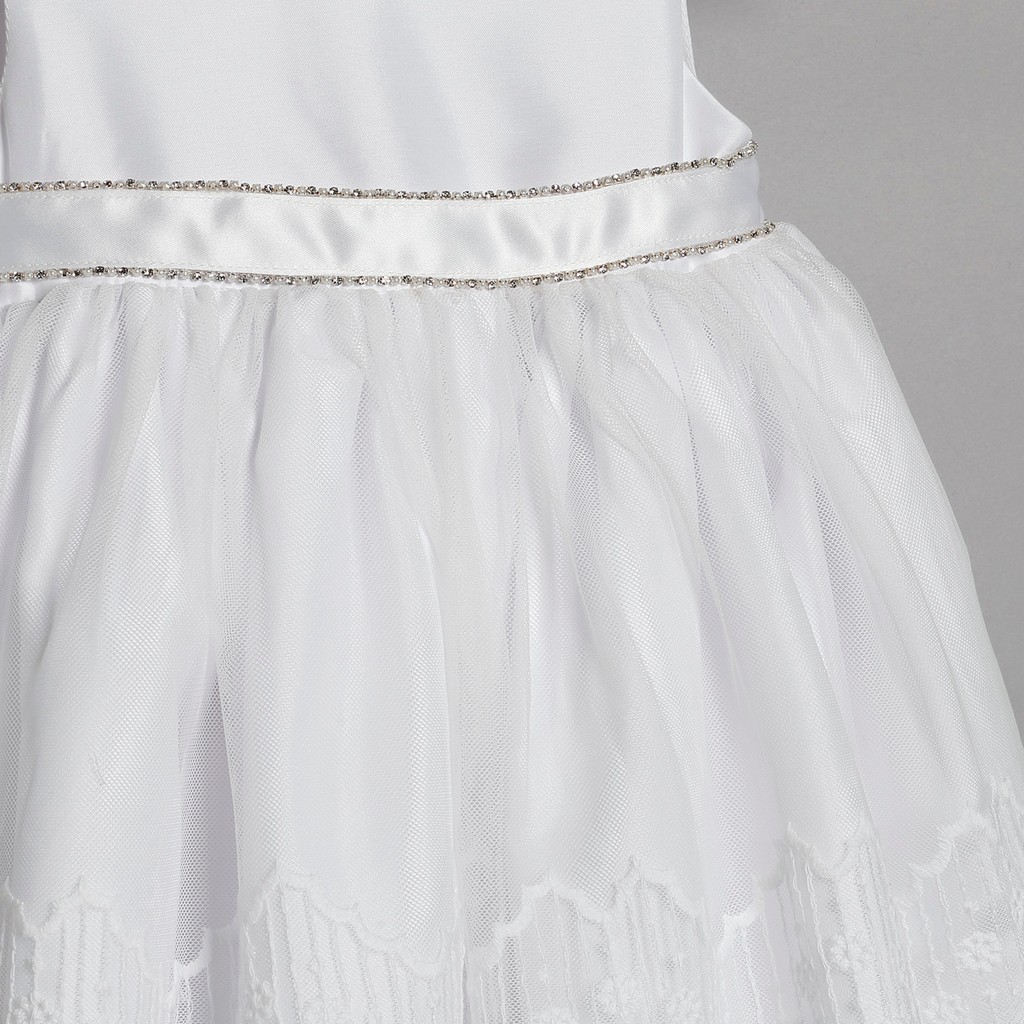 Φόρεμα από άσπρη τούλινη δαντέλα στολισμένο με σατέν ζώνη με στρασάκια.