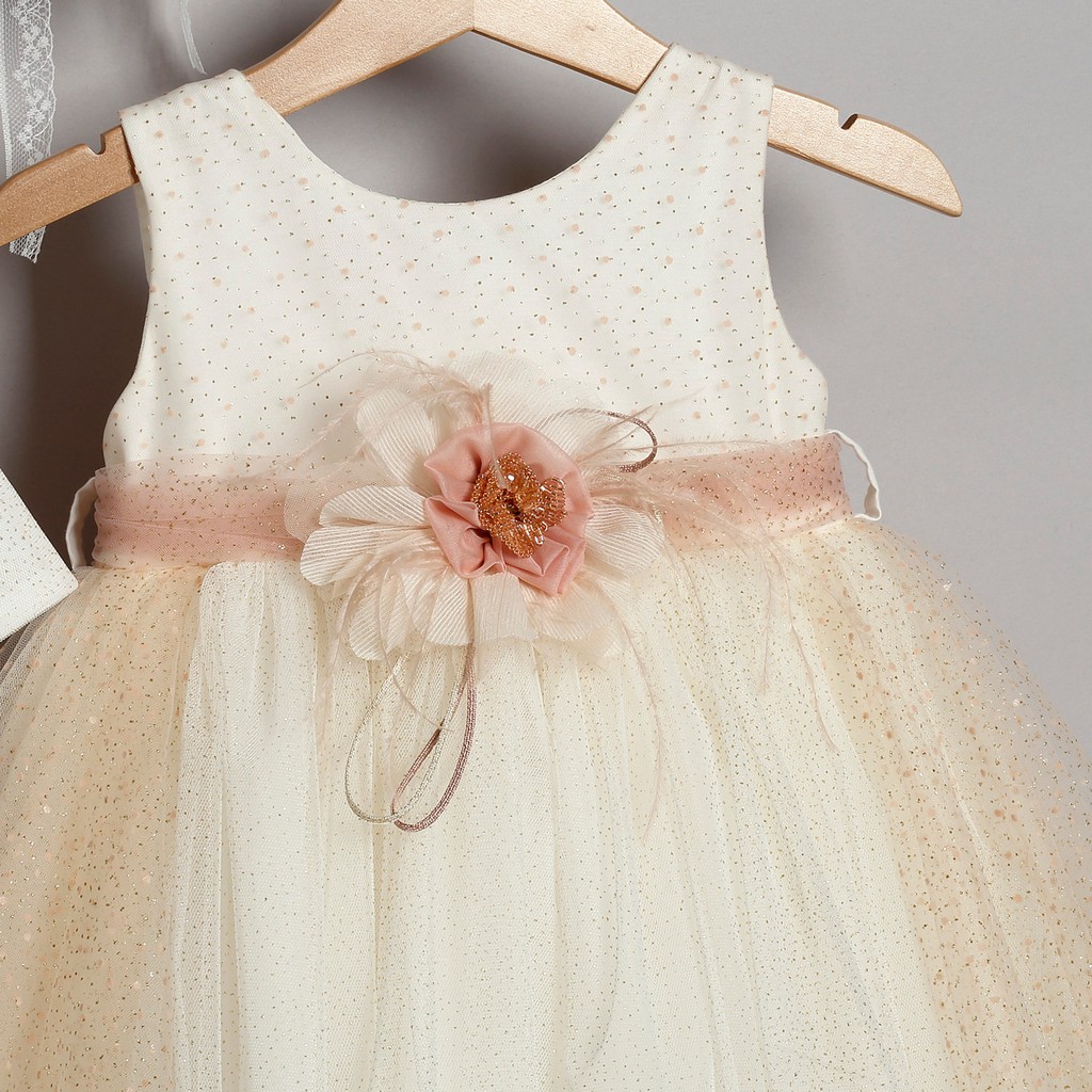 Φόρεμα από χρυσό γκλίτερ τούλι στολισμένο με ζώνη από γκλίτερ τούλι, λουλούδι και πούπουλα.