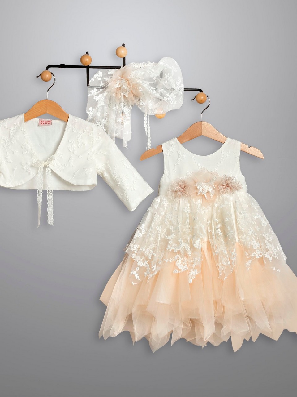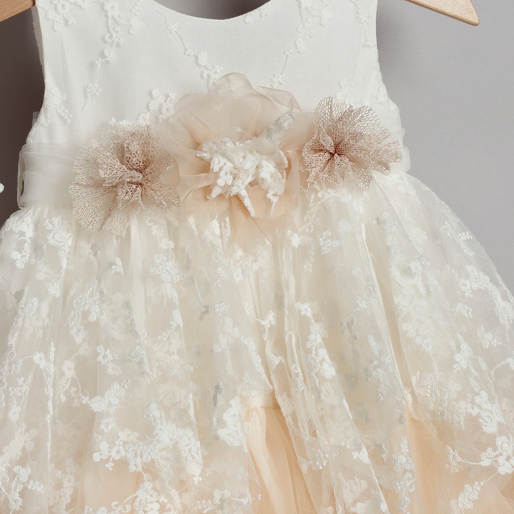 Φόρεμα από εκρού δαντέλα και σωμόν τούλι στολισμένο με τούλινη ζώνη και δαντελένια λουλούδια.