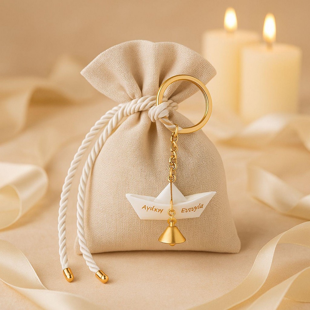 Μπομπονιέρα γάμου κρεμαστό μπρελόκ καραβάκι χαραγμένο με τις πιο θερμές ευχές για τους καλεσμένους σας.