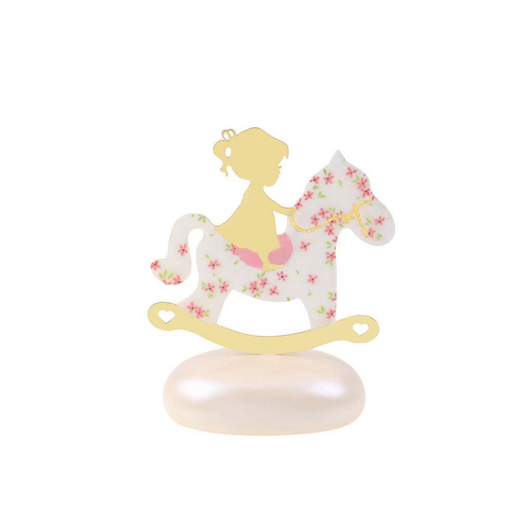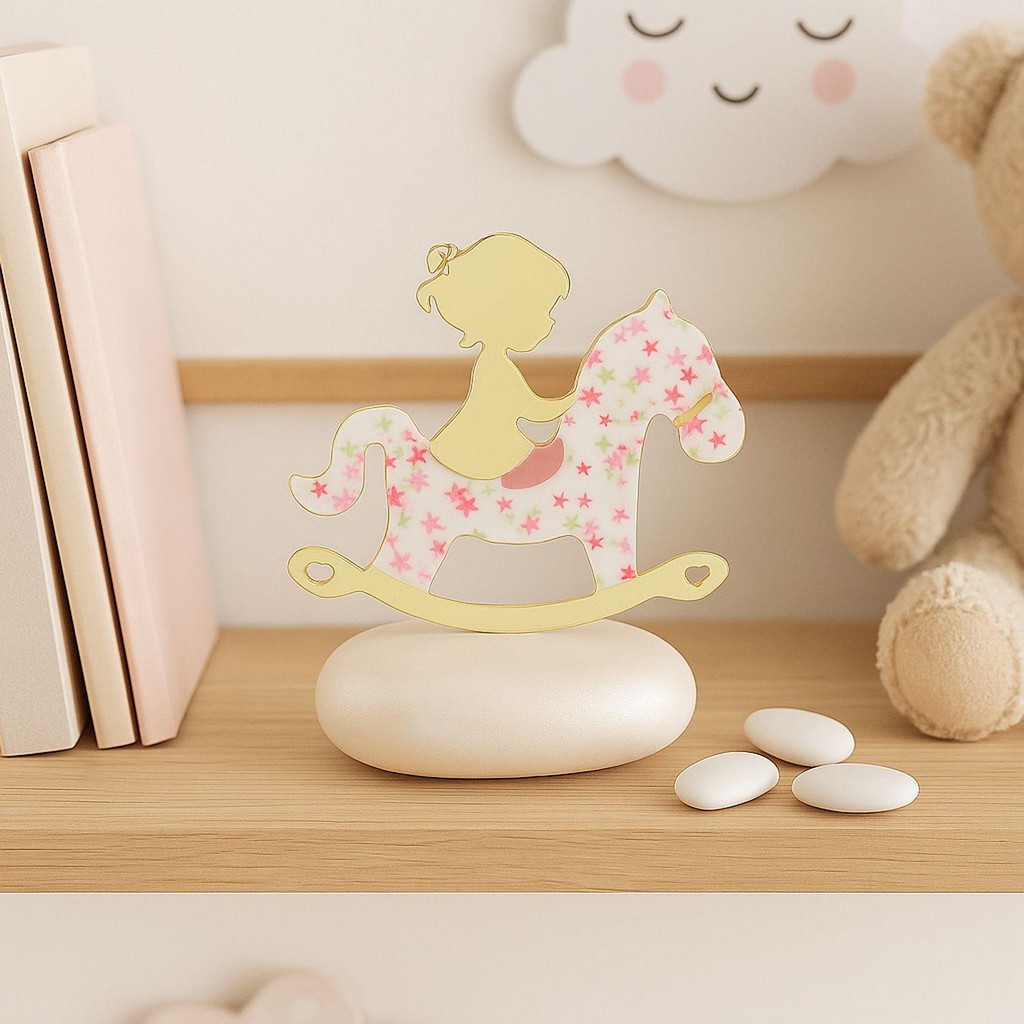 Μια ονειρική μπομπονιέρα βάπτισης που ξυπνά παιδικές αναμνήσεις, ένα μεταλλικό κορίτσι σε αλογάκι στολισμένο με ρομαντικά λουλούδια που θα ενθουσιάσει τους καλεσμένους σας.