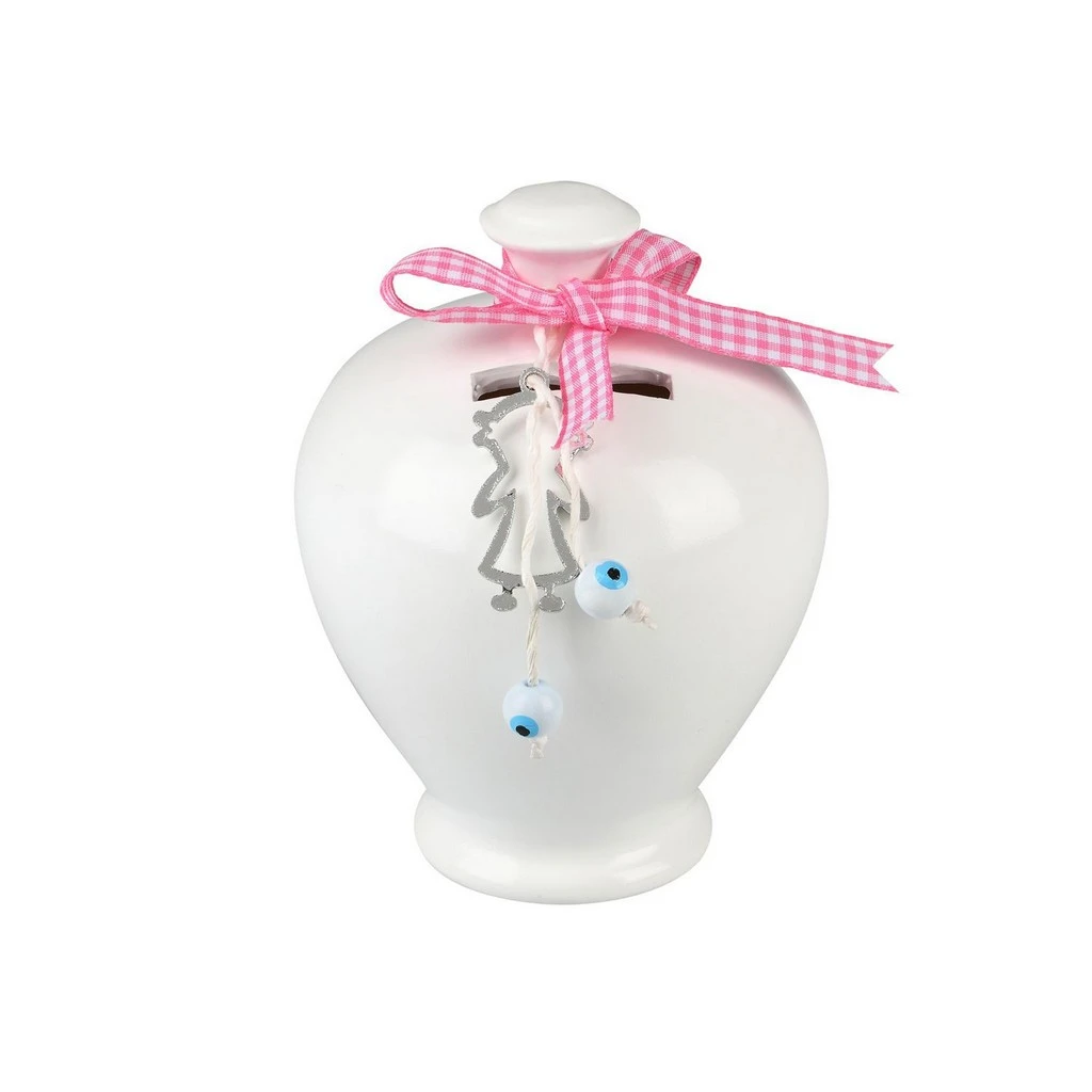 Ένα αξέχαστο δώρο κουμπάρας καλαίσθητα διακοσμημένος με ένα μεταλλικό κορίτσι και ματάκια για καλή τύχη και αποταμίευση.