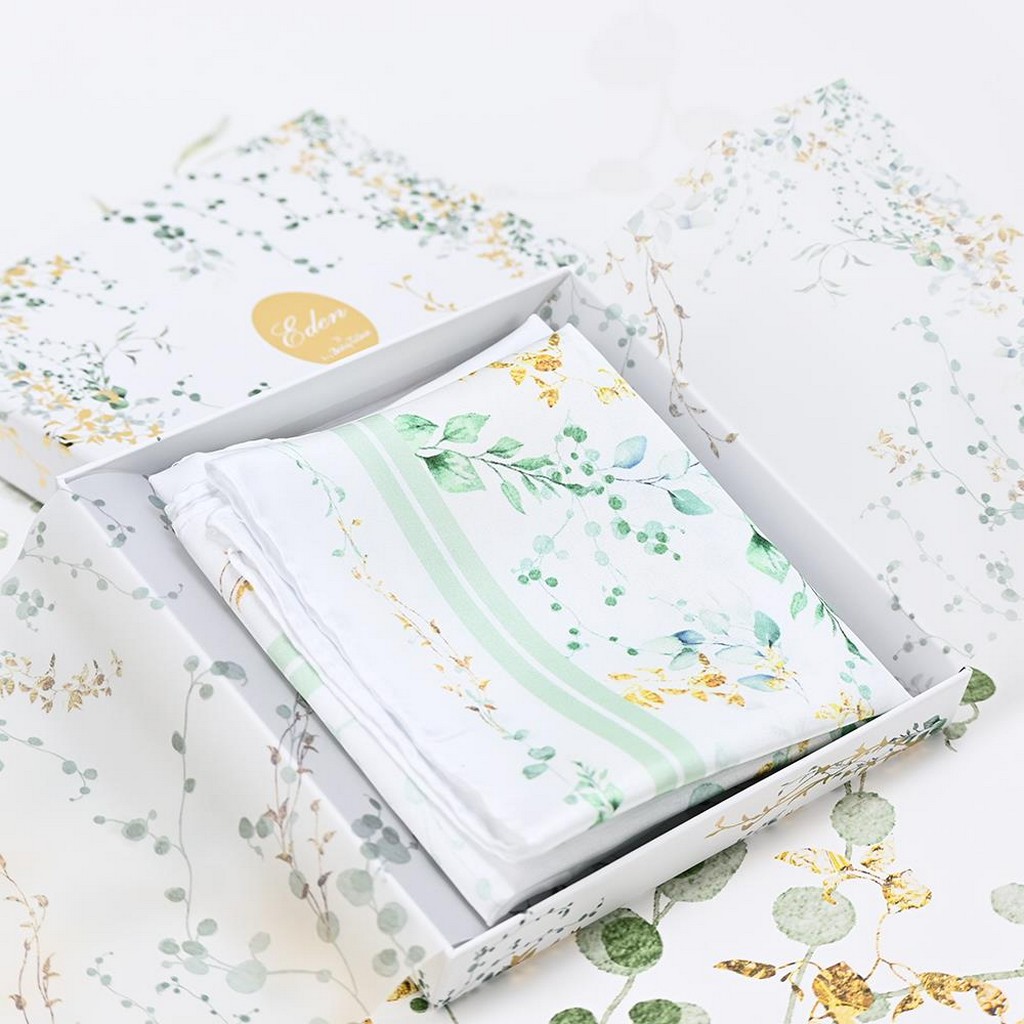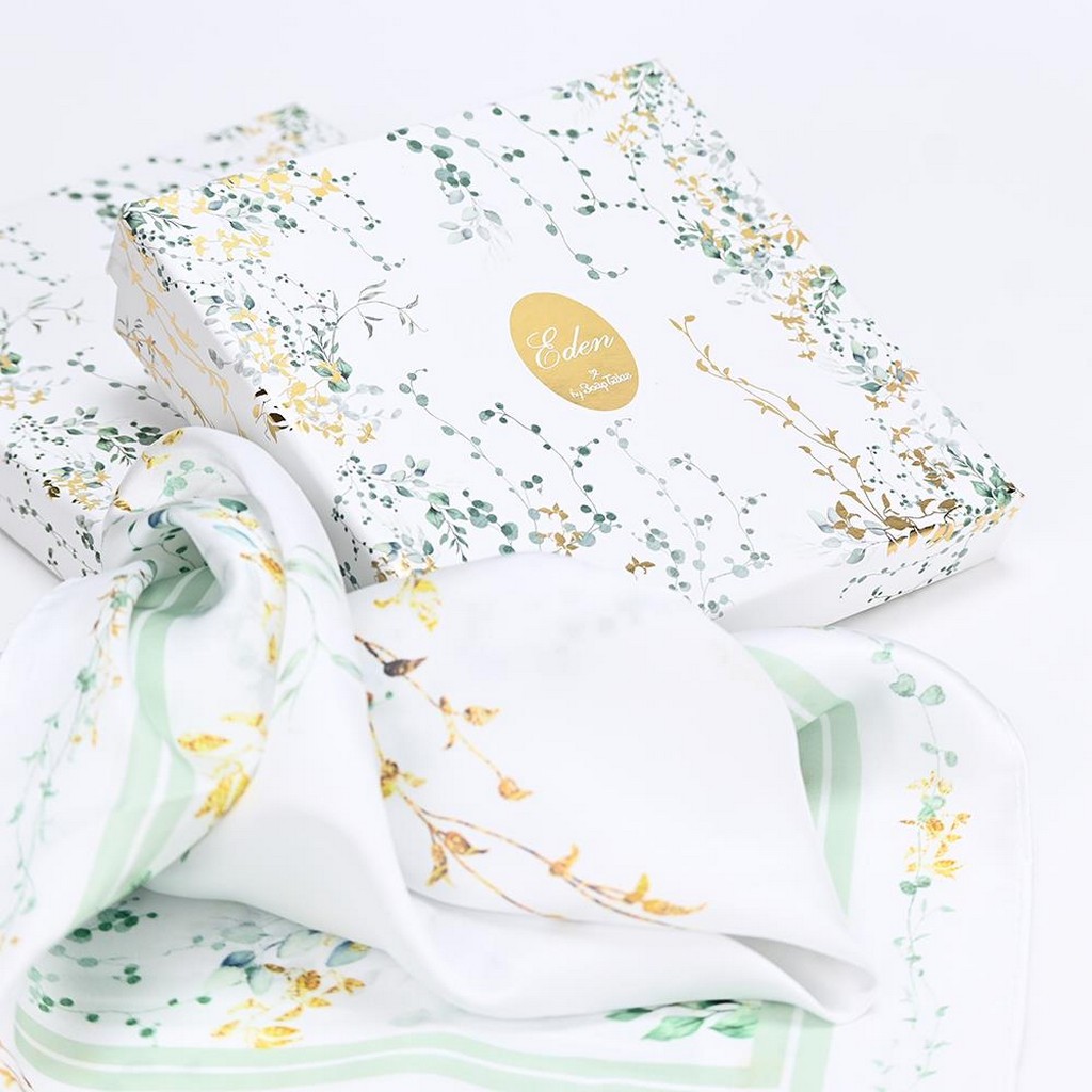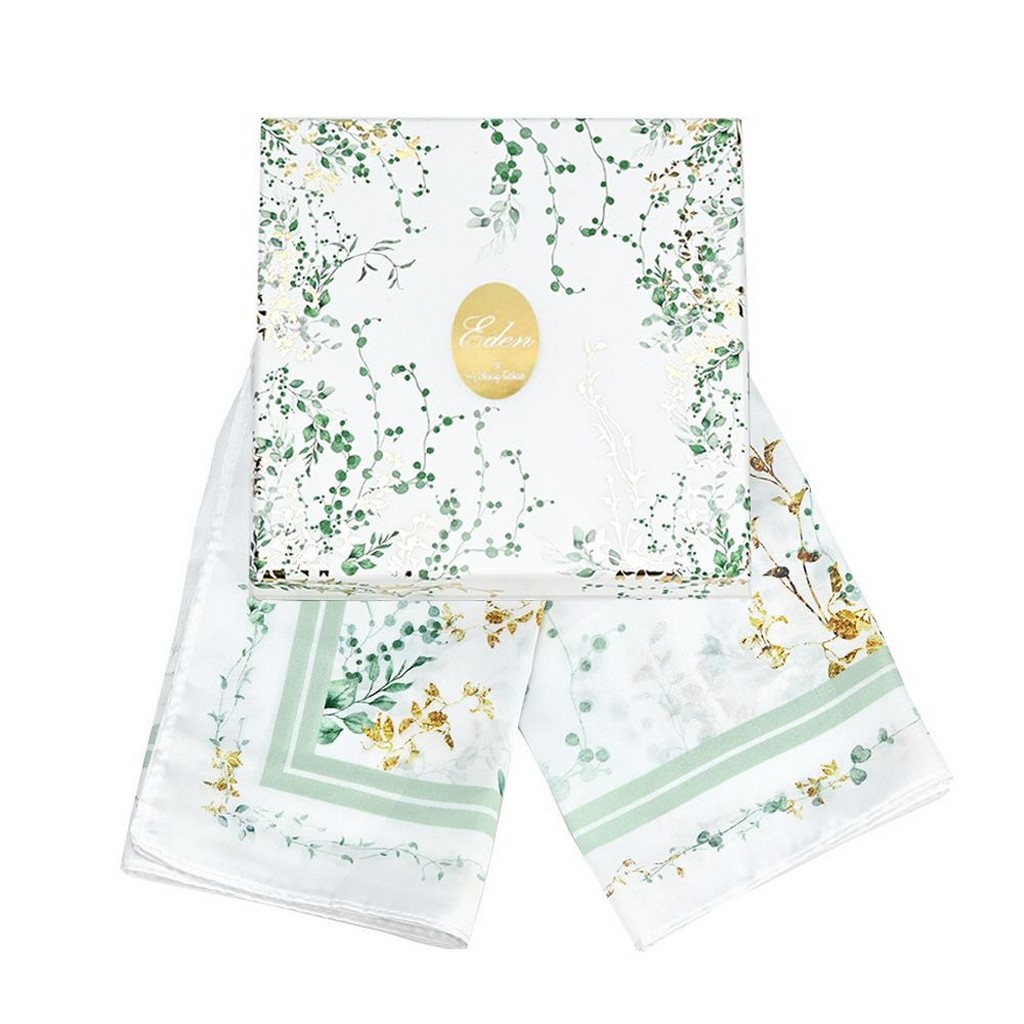 Το μαντίλι της σειράς Eden, με σχέδιο σε γήινες αποχρώσεις του πράσινου και λεπτομέρειες με χρυσές πινελιές, σε διάσταση 50x50cm, αποπνέει φρεσκάδα και εκλεπτυσμένο στυλ.