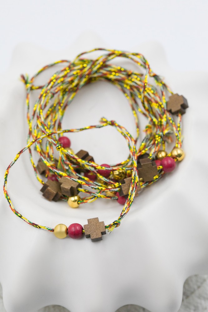 Μαρτυρικό βραχιόλι με ξύλινο καφέ σταυρό, κόκκινο χαολίτη χάντρα και τρίχρωμο κορδόνι. Οι φωτογραφίες έχουν υποστεί επεξεργασία και τα χρώματα ίσως να διαφέρουν λίγο στην πραγματικότητα. Η τιμή αφορά συσκευασία 50 τεμαχίων.