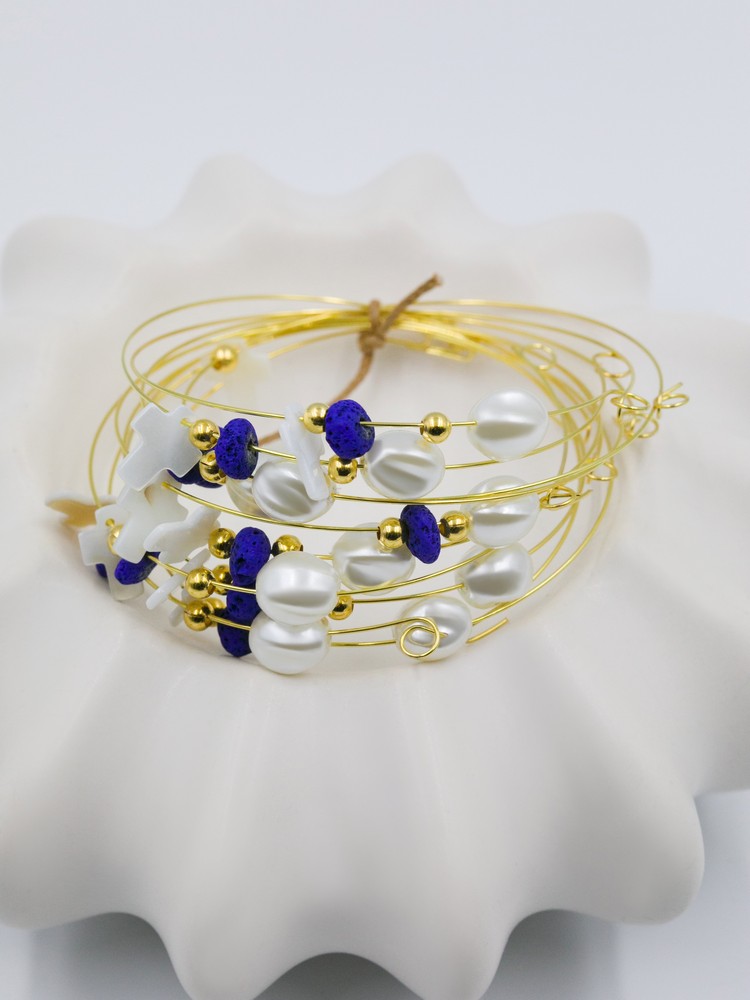Μαρτυρικό βραχιόλι σύρμα memories, πέρλα, μπλε λάβα και φίλντισι σταυρός. Οι φωτογραφίες έχουν υποστεί επεξεργασία και τα χρώματα ίσως να διαφέρουν λίγο στην πραγματικότητα. Η τιμή αφορά συσκευασία 50 τεμαχίων.