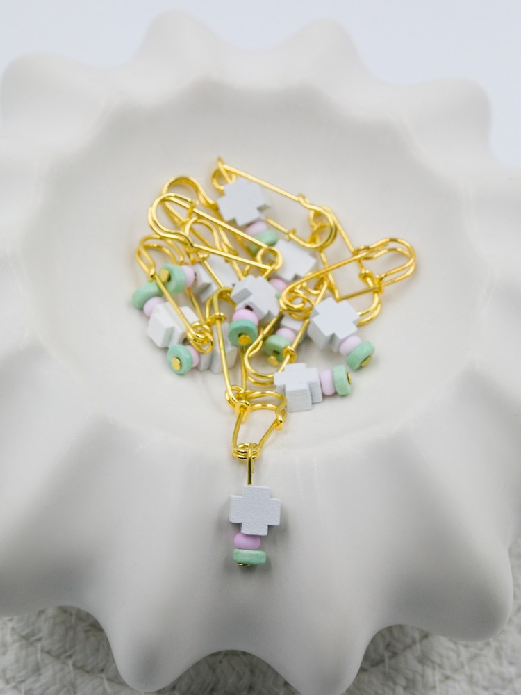 Μαρτυρικό καρφίτσα λευκό ξύλινο σταυρό και χάντρες ροζ και βεραμάν. Οι φωτογραφίες έχουν υποστεί επεξεργασία και τα χρώματα ίσως να διαφέρουν λίγο στην πραγματικότητα. Η τιμή αφορά συσκευασία 50 τεμαχίων.