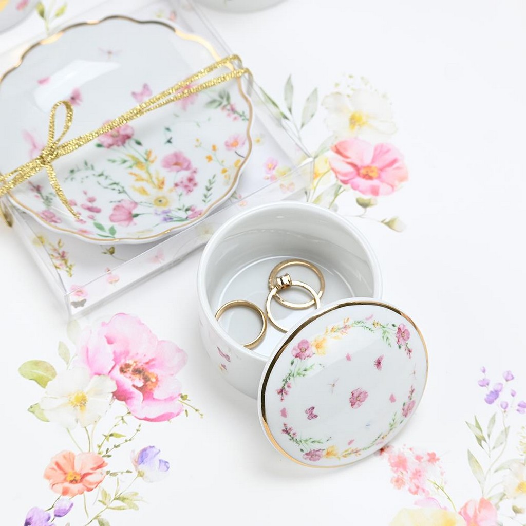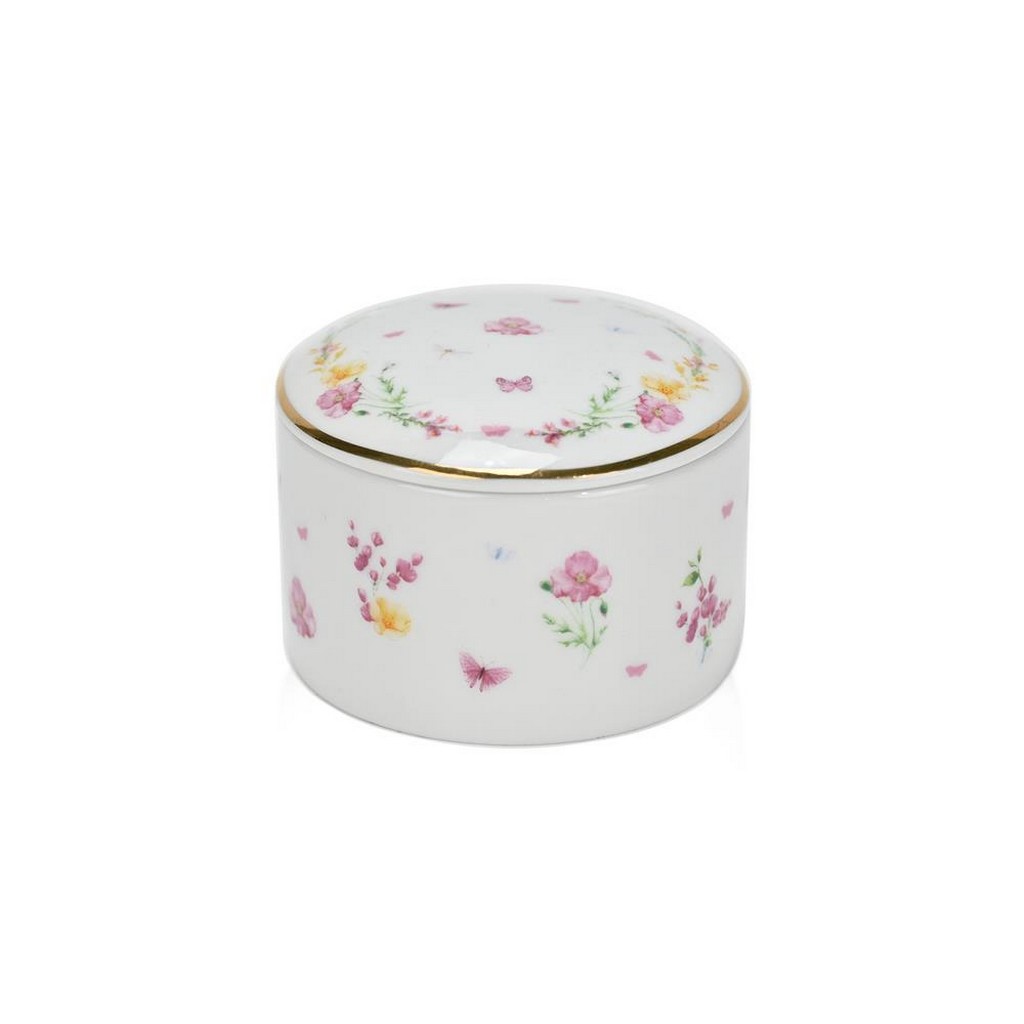 Πορσελάνινη μπιζουτιέρα διακοσμημένη με ανάλαφρα λουλούδια και πεταλούδες σε παστέλ αποχρώσεις, που φέρνουν ανοιξιάτικη φρεσκάδα και γλυκύτητα σε κάθε χώρο.