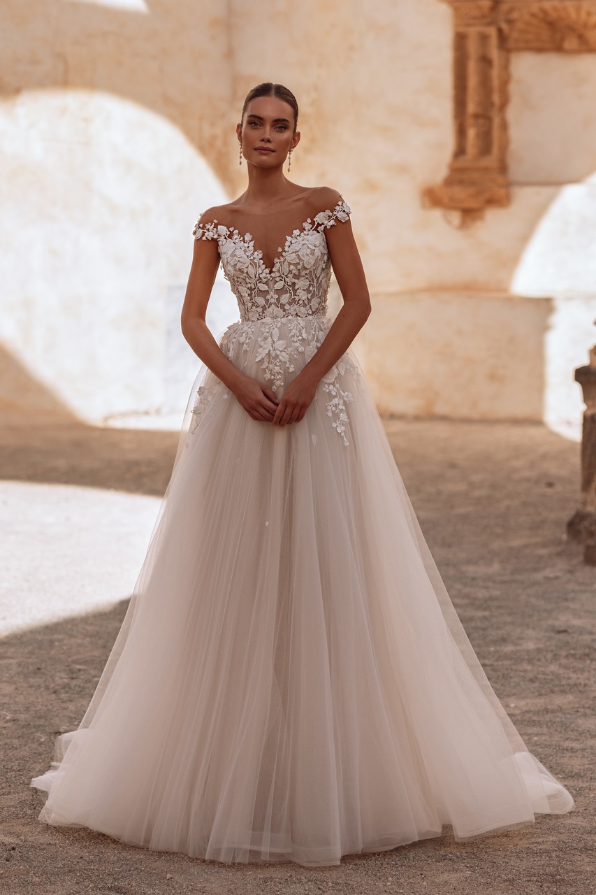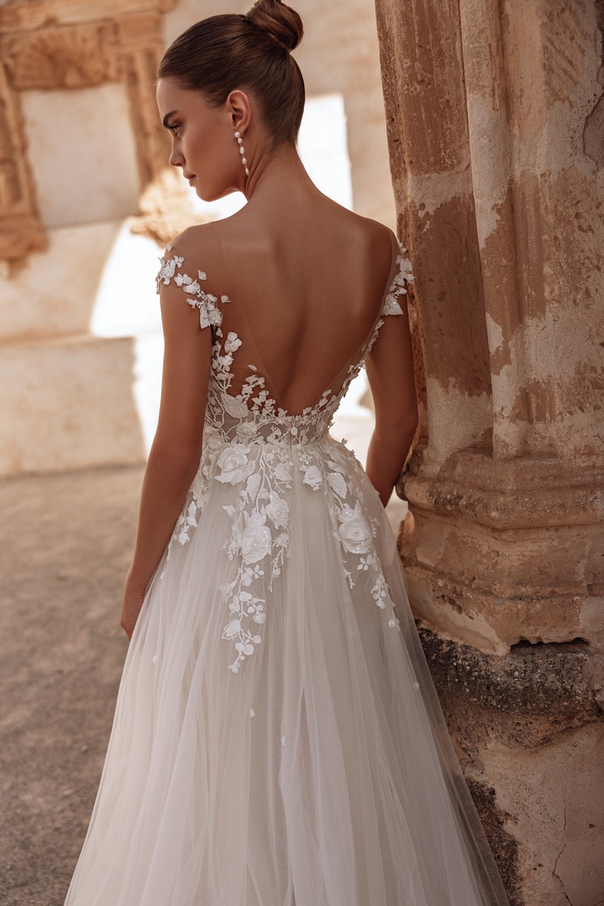 Το Andrea είναι ένα φόρεμα που συνδυάζει τη λεπτότητα με την αυτοπεποίθηση, προσφέροντας μια εμφάνιση που είναι ταυτόχρονα ρομαντική και εκλεπτυσμένη. Το ντεκολτέ με την ψευδαίσθηση, διακοσμημένο με φλοράλ απλικέ, δημιουργεί την αίσθηση δαντέλας που ακουμπάει απαλά στο δέρμα, ενώ το εφαρμοστό μπούστο αναδεικνύει τη μέση με διακριτική δομή. Η χαμηλή πλάτη σε σχήμα V προσθέτει μια μοντέρνα πινελιά, εξισορροπώντας την απαλότητα με τη γοητεία. Ριχτές στρώσεις τούλι σχηματίζουν μια ελαφριά, χαριτωμένη φούστα που κινείται όμορφα με κάθε βήμα, δημιουργώντας μια σιλουέτα που είναι αβίαστα θηλυκή. Αυτό το φόρεμα σχεδιάστηκε για νύφες που θέλουν να συνδυάσουν τη χάρη με την ατομικότητα – μια εμφάνιση που είναι αξέχαστη, κομψή και γεμάτη χαρακτήρα.