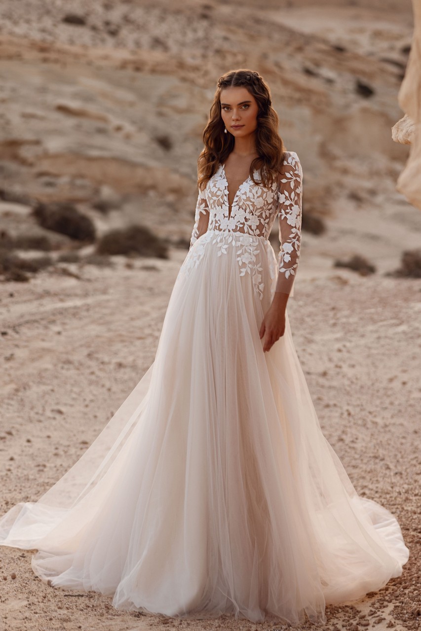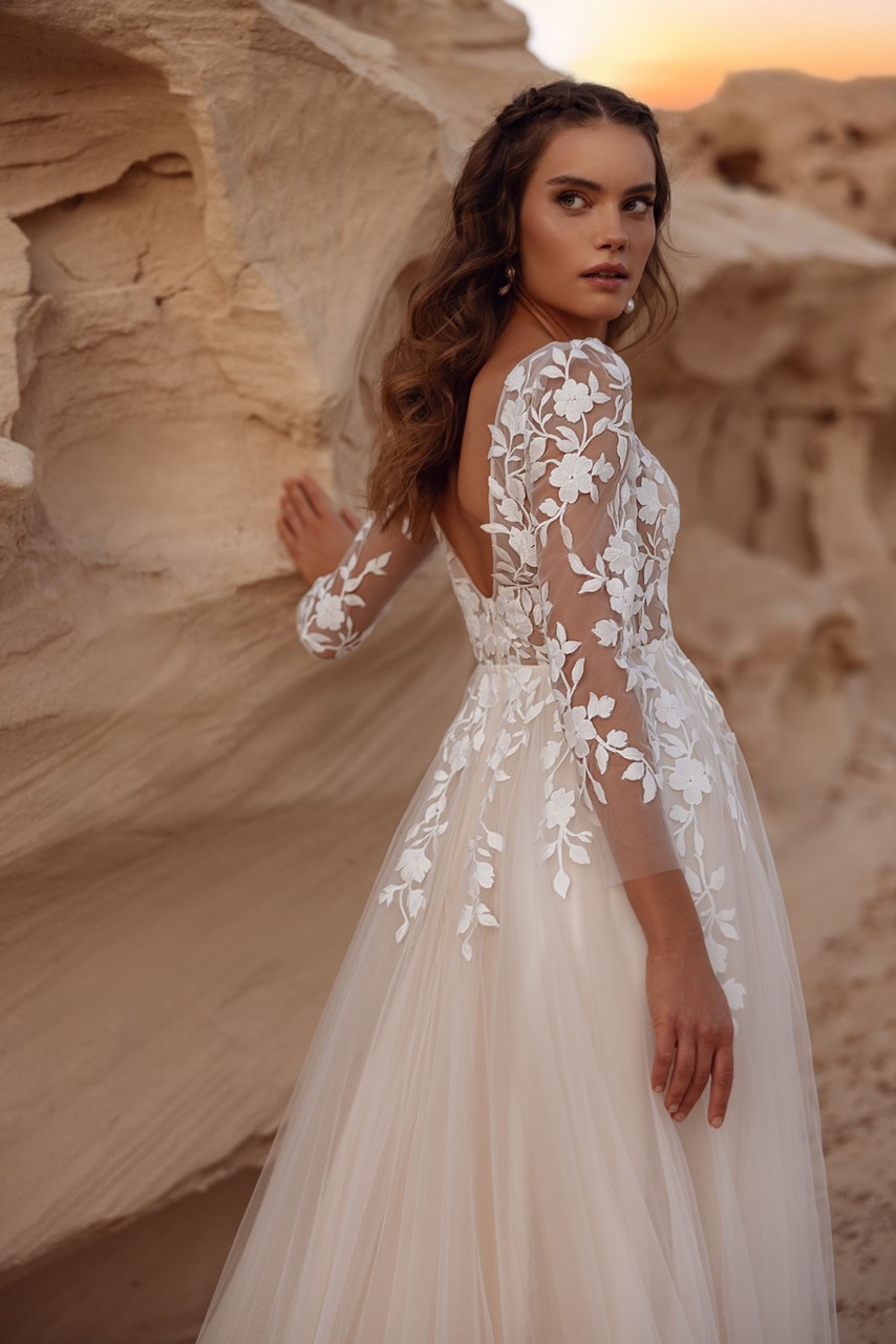 Το Armori είναι ένα φόρεμα σχεδιασμένο για νύφες που θέλουν μια εμφάνιση ρομαντική, εκλεπτυσμένη και αβίαστα θηλυκή. Η βαθιά λαιμόκοψη σε σχήμα V διαμορφώνει όμορφα τη σιλουέτα, ενώ το εφαρμοστό μπούστο με απλικέ από φλοράλ δαντέλα τραβάει την προσοχή με τις λεπτές λεπτομέρειες. Τα διάφανα μακριά μανίκια προσφέρουν μια αίσθηση ελαφριάς κάλυψης, ολοκληρώνονται με ασορτί δαντέλα που συνδυάζεται άψογα με το σχέδιο. Η ρέουσα φούστα από τούλι δημιουργεί απαλή κίνηση, δίνοντας στο φόρεμα έναν ανάλαφρο και χαριτωμένο χαρακτήρα που είναι εντυπωσιακός χωρίς να είναι υπερβολικός. Αυτό είναι ένα φόρεμα για γυναίκες που θέλουν να αισθάνονται σίγουρες, χαριτωμένες και πραγματικά αξέχαστες την ημέρα του γάμου τους – ένα σχέδιο που εξισορροπεί την απαλότητα με τη δύναμη σε κάθε λεπτομέρεια.