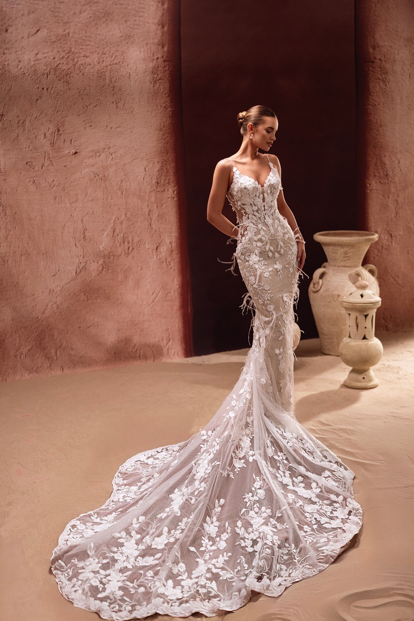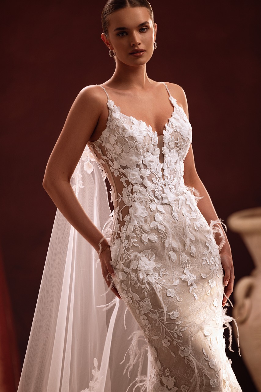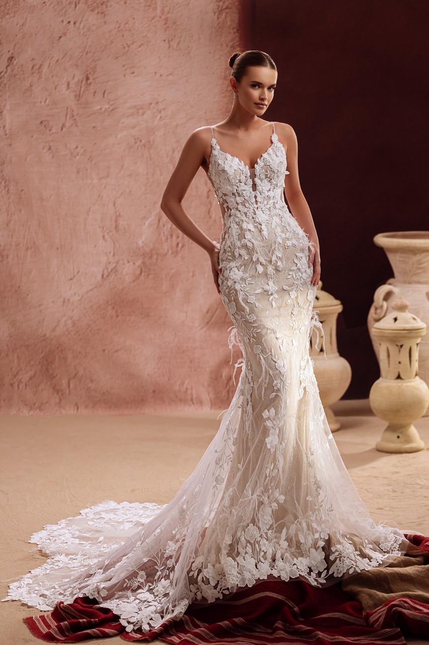 Το Aspasia είναι ένα νυφικό σχεδιασμένο για νύφες που θέλουν μια εμφάνιση εντυπωσιακή, θηλυκή και αξέχαστη. Η σιλουέτα της γοργόνας που αγκαλιάζει το σώμα αναδεικνύει τις φυσικές καμπύλες, ενώ οι λεπτές φλοράλ δαντελένιες απλικέ ρέουν άψογα από το μπούστο μέχρι την εντυπωσιακή ουρά. Οι λεπτές τιράντες και το σμιλεμένο ντεκολτέ πλαισιώνουν όμορφα τους ώμους, ενώ οι πλαϊνές λεπτομέρειες με την ψευδαίσθηση προσδίδουν ακριβώς τη σωστή δόση γοητείας. Η μακριά δαντελένια ουρά ολοκληρώνει το σχέδιο, διασφαλίζοντας ότι κάθε βήμα αφήνει μια διαρκή εντύπωση. Αυτό το νυφικό δημιουργήθηκε για γυναίκες που εκτιμούν την ομορφιά με την αυτοπεποίθηση – ένα σχέδιο που συνδυάζει τον ρομαντισμό, τη δύναμη και την ατομικότητα σε τέλεια αρμονία.