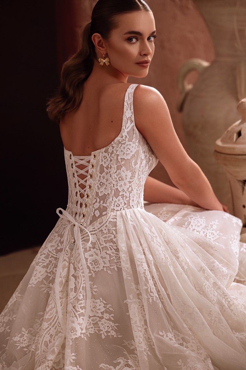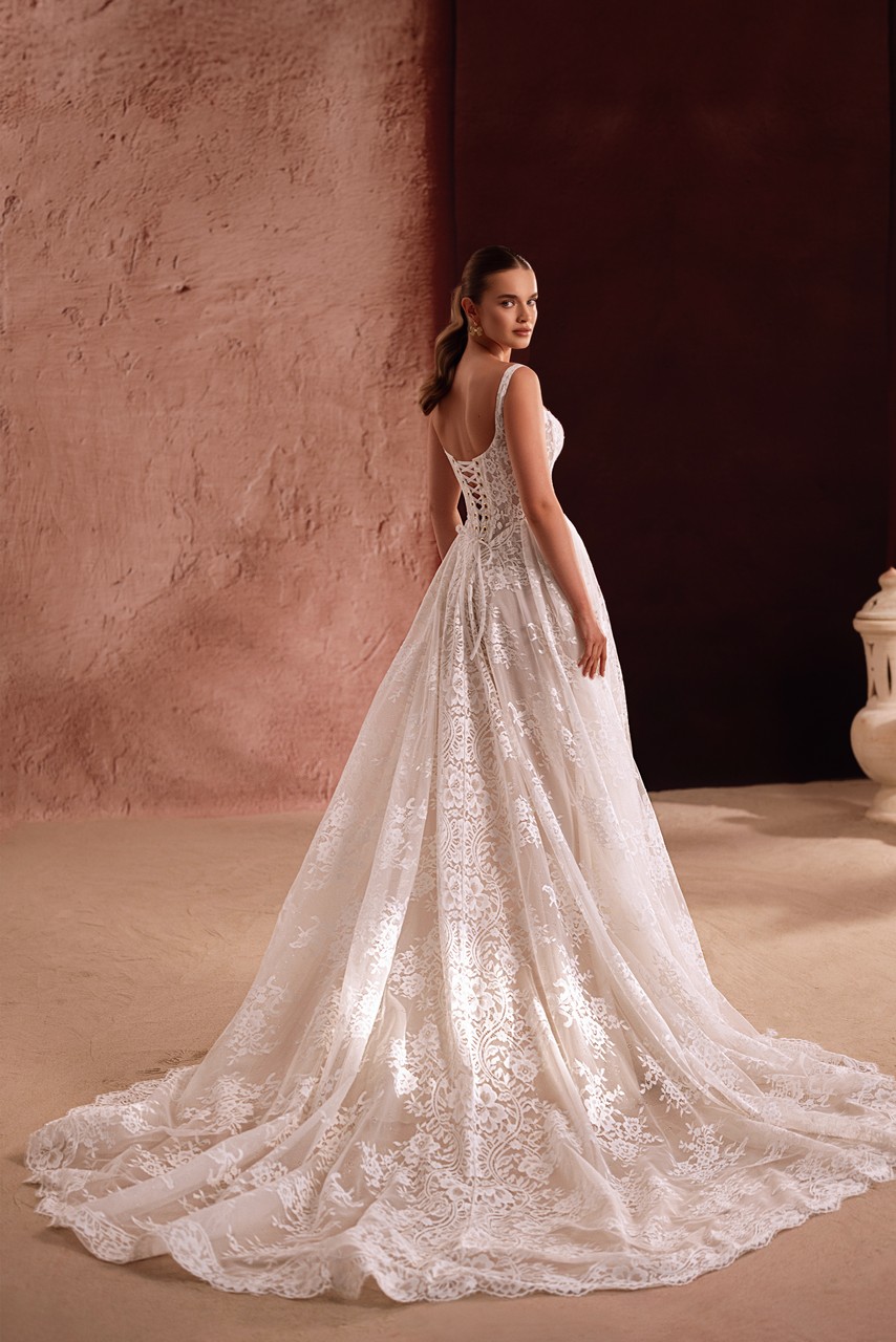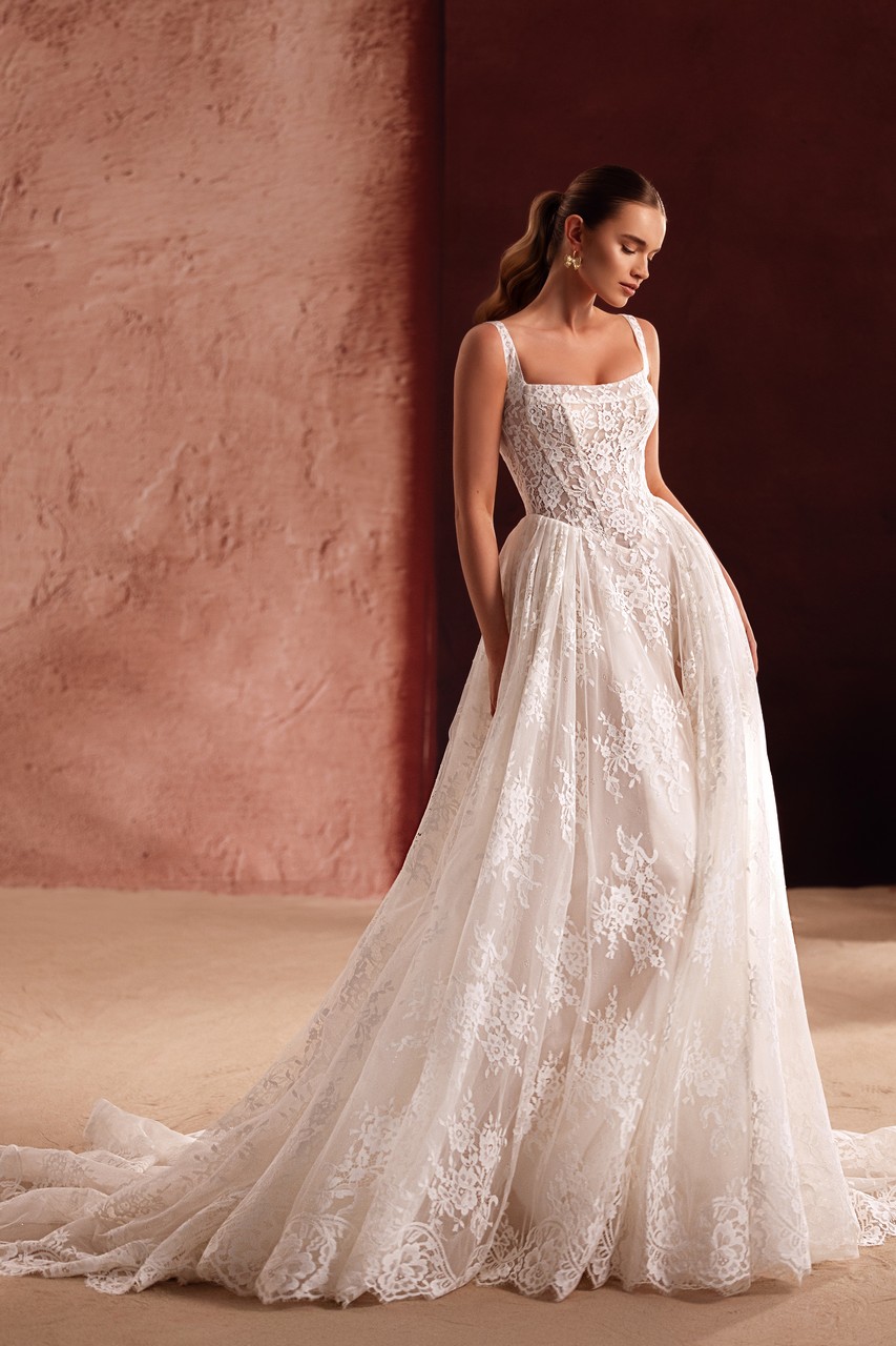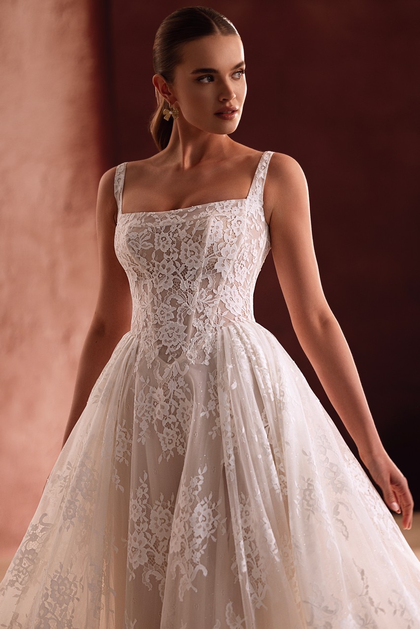 Το Becco είναι ένα φόρεμα που δημιουργήθηκε για νύφες που εκτιμούν τη λεπτομέρεια όσο και την παρουσία. Το δομημένο μπούστο με τις φαρδιές τιράντες πλαισιώνει όμορφα το ντεκολτέ, ενώ το σχέδιο δαντέλας σε όλη την επιφάνεια δίνει στο φόρεμα ένα πλούσιο, ανάγλυφο φινίρισμα. Ρέοντας μέσα σε μια φαρδιά φούστα και μια φαρδιά ουρά, το φόρεμα κινείται με χάρη και δημιουργεί μια εντυπωσιακή εντύπωση από κάθε γωνία. Αυτό το φόρεμα συνδυάζει τον ρομαντισμό με τη δύναμη – ιδανικό για νύφες που θέλουν η εμφάνισή τους να είναι διαχρονική αλλά και πραγματικά προσωπική.